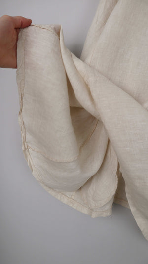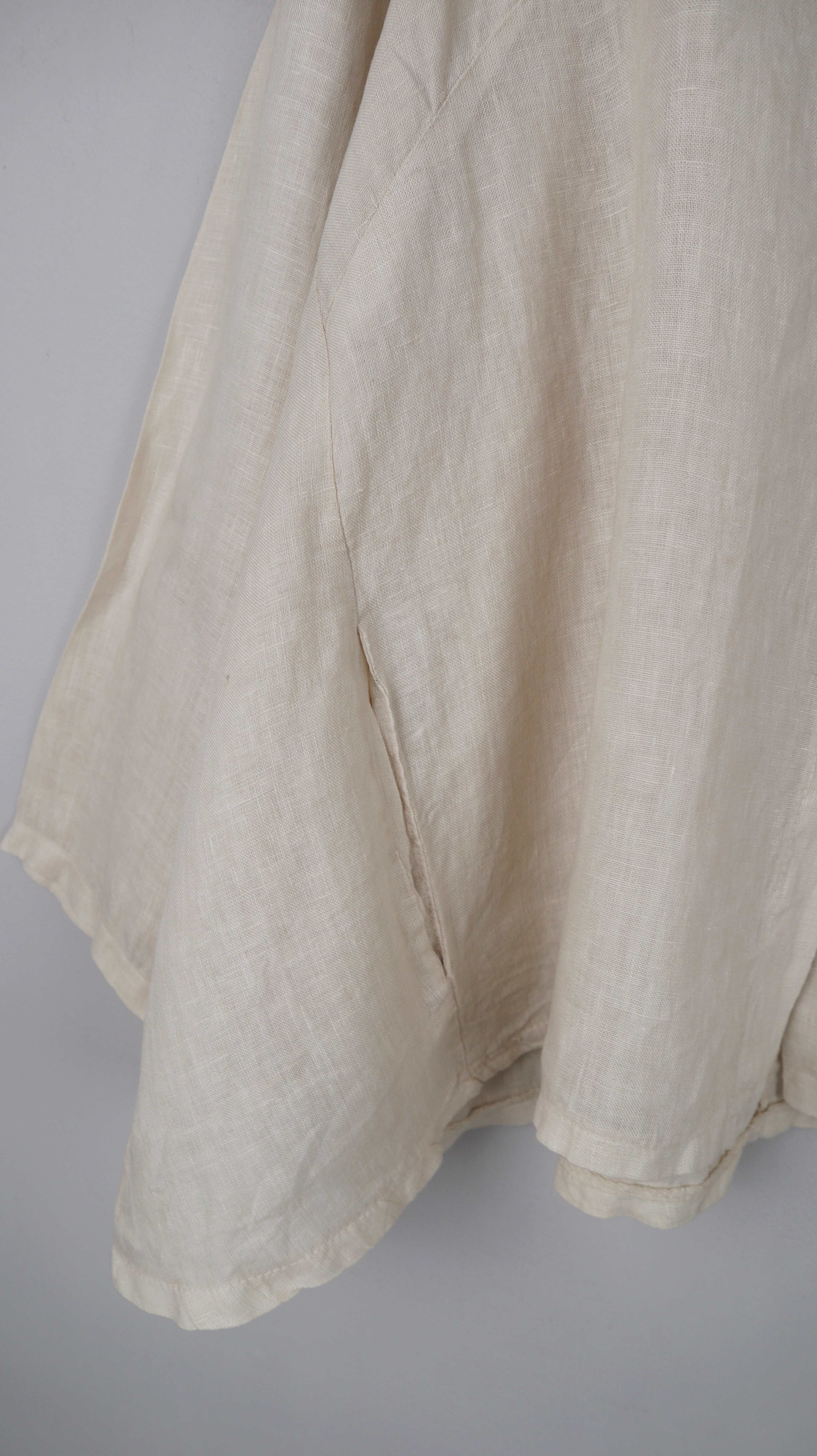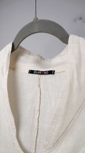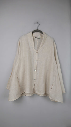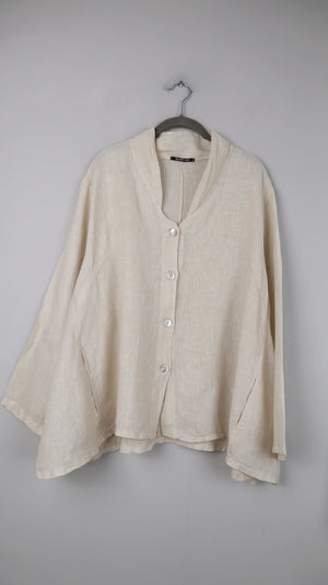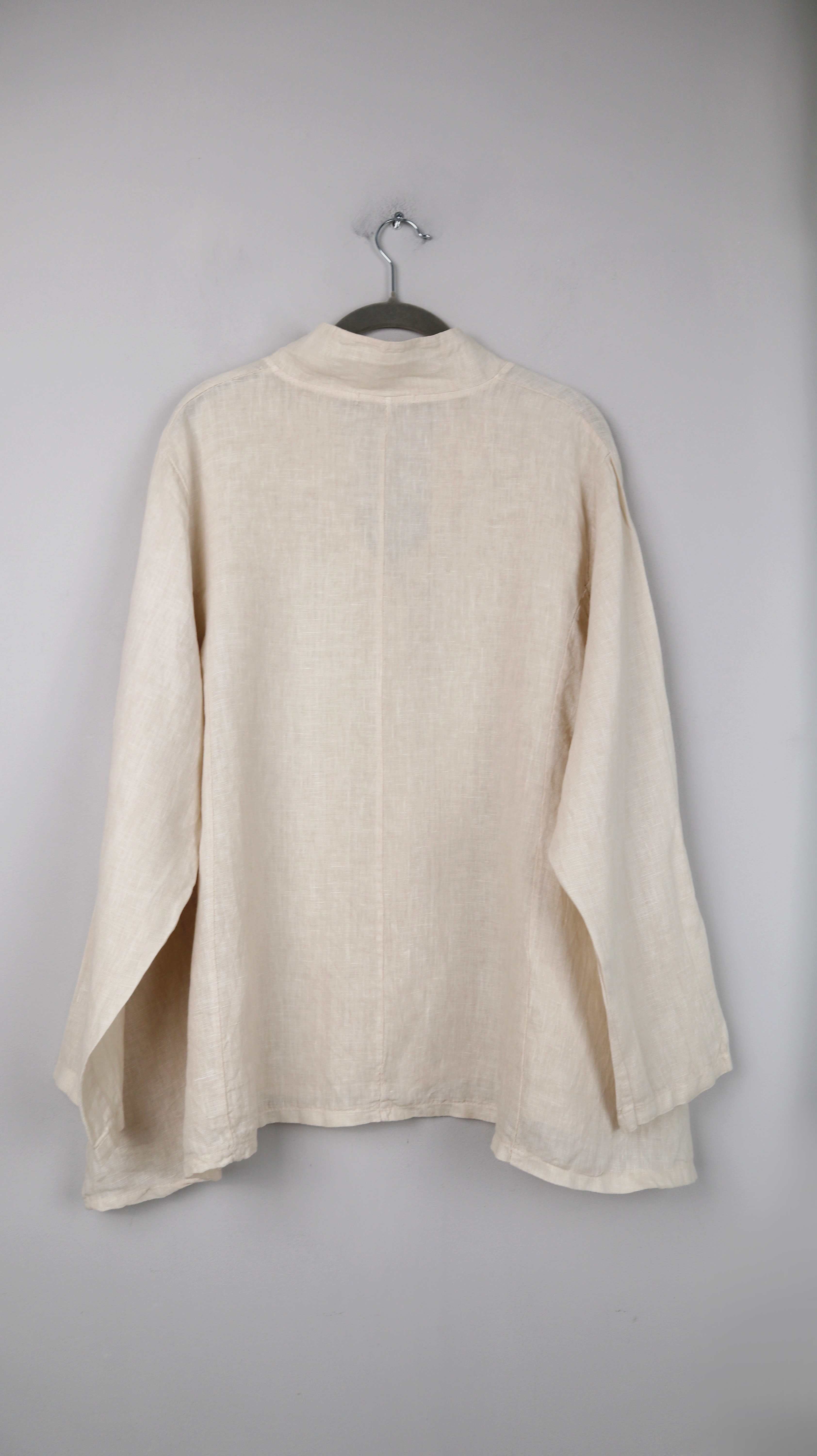 Sehr schöne, lockere Bluse in einem hellen Creme von Silkroad aus Leinen. Sie passt einer 40 L bis 42 XL und hat Perlmuttknöpfe. 56 cm Achselweite und 58 cm Länge. Plus Versand