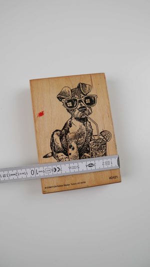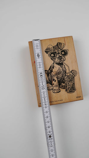 Großer Holzstempel mit Hundemotiv, der einen Cocktail schlürft. Plus Versand