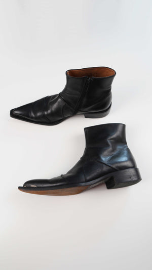 Schwarze Lederstiefeletten in 42. Sie sind sehr markant und haben vorne ein kleines Stück Metall an der Spitze. Die Spitze ist bei beiden ganz leicht lose. Das müsste man ggf. mit der Zeit kleben lassen. Plus Versand