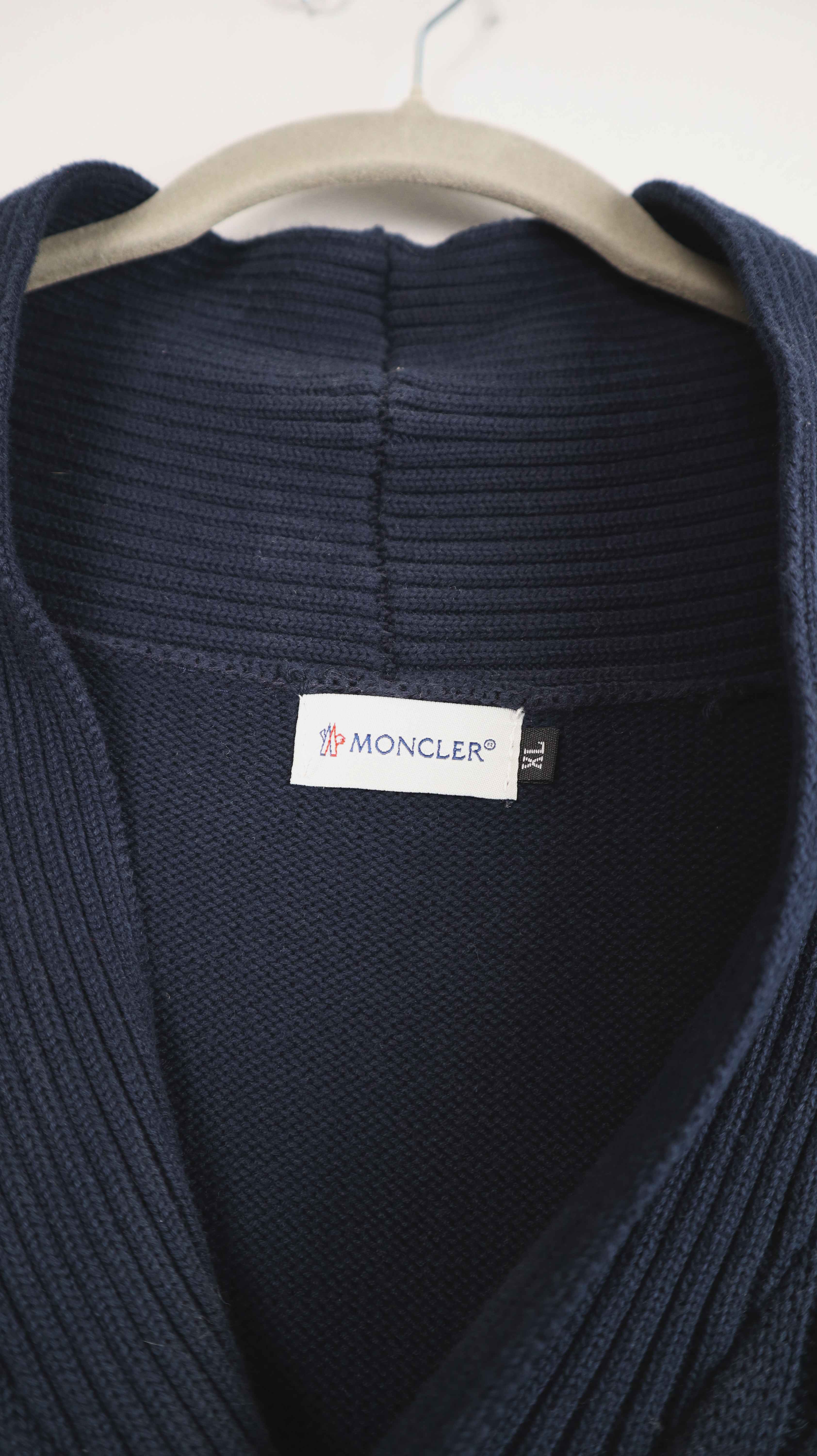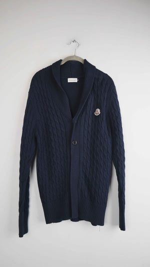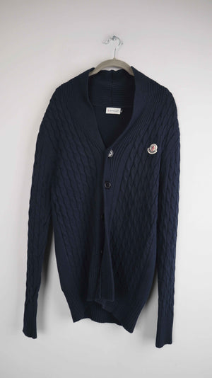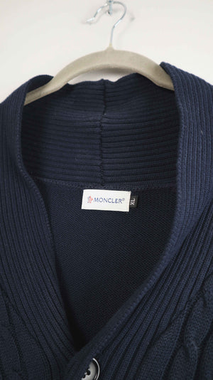 Dunkelblaue Strickjacke mit Zopfmuster, die einer 40 L passt. 52 cm Achselweite und 62 cm Länge. Plus Versand