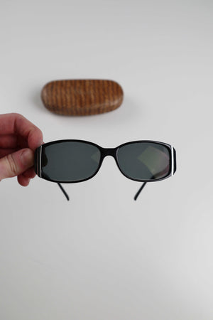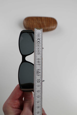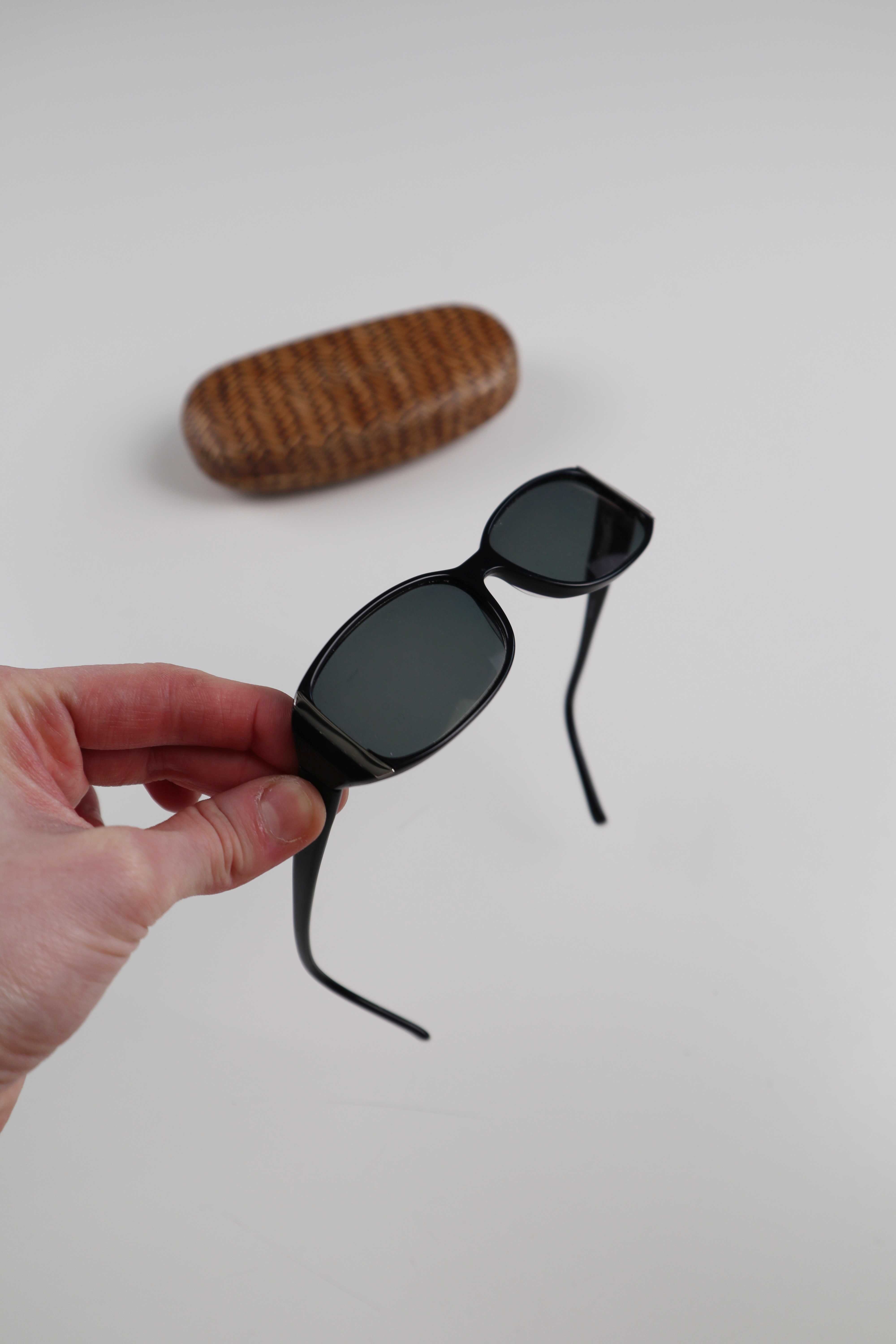 Schwarze Sonnenbrille im 90s Style. Sie ist von einer italienischen Brand, Studio Milano. Die Brand ist innen nicht mehr vollständig lesbar. Die Brille hat Gläser mit Sehstärke drin. Plus Versand