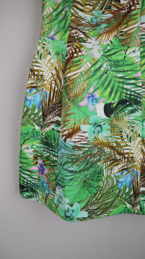 Grünes Dschungelkleid in Midillänge. 43 cm Achselweite und 77 cm Länge. Plus Versand