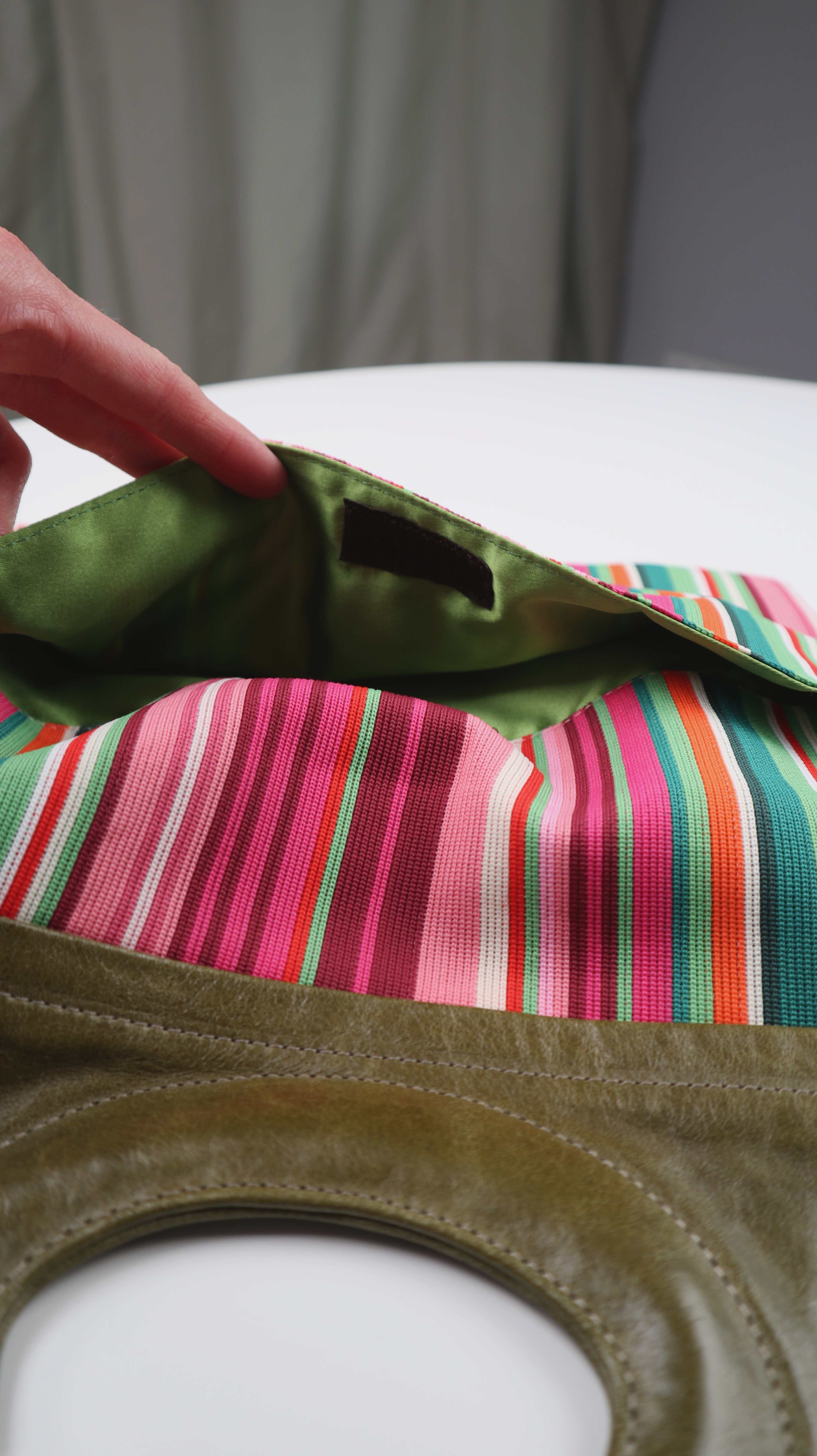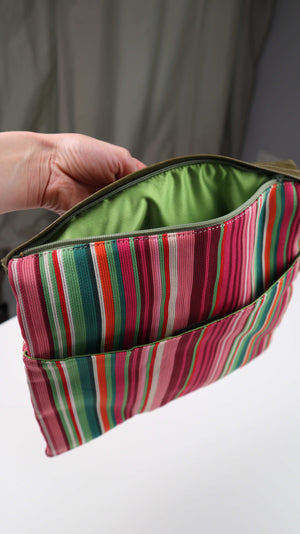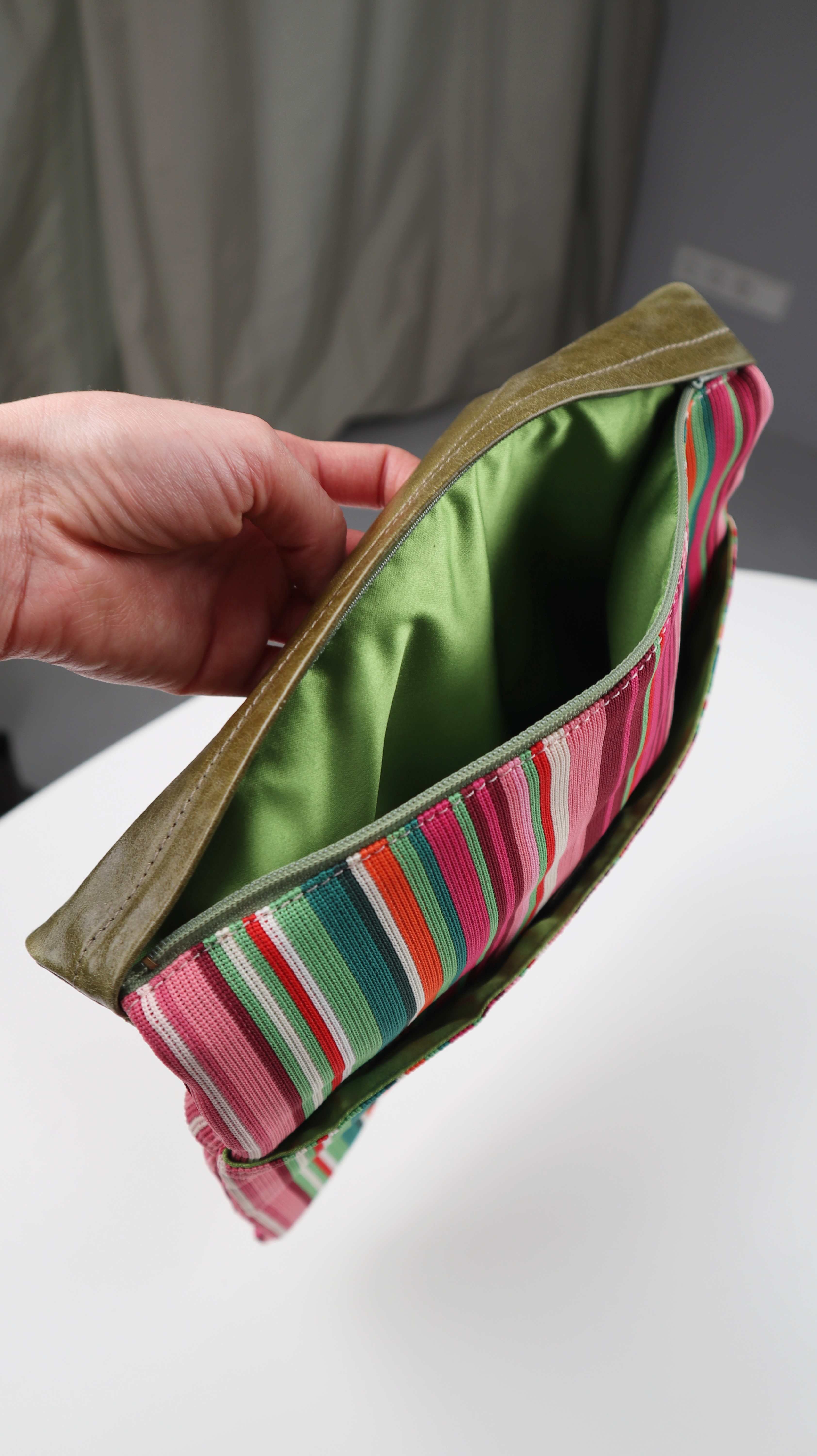 Gestreifte Tasche mit einem Lederteil und kleinen Fächern. Man kann sie als Clutch oder als Tragetasche nehmen. Plus Versand