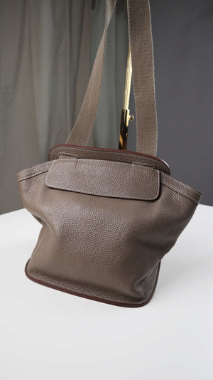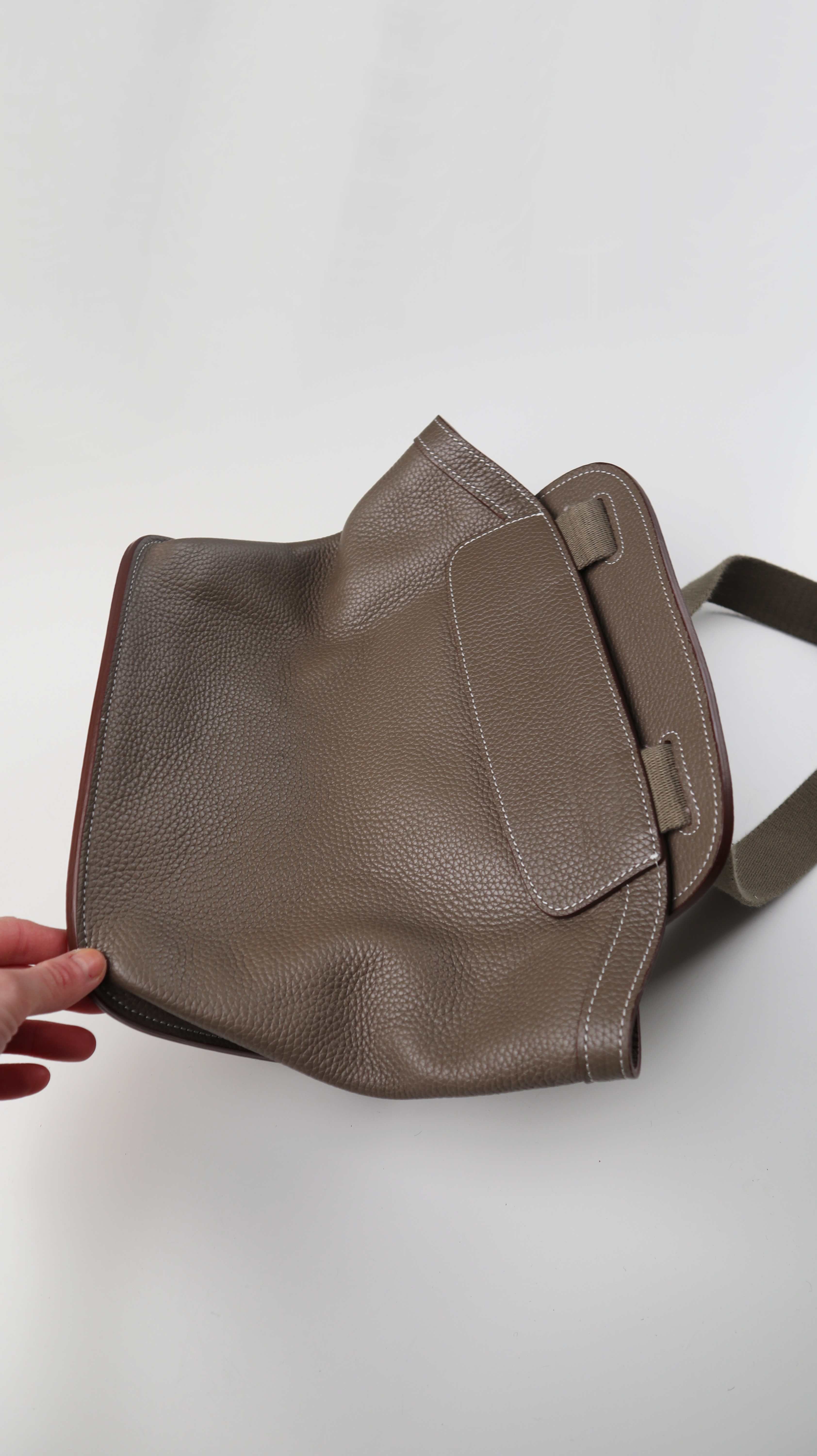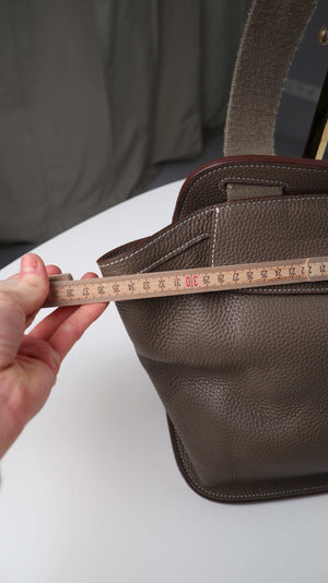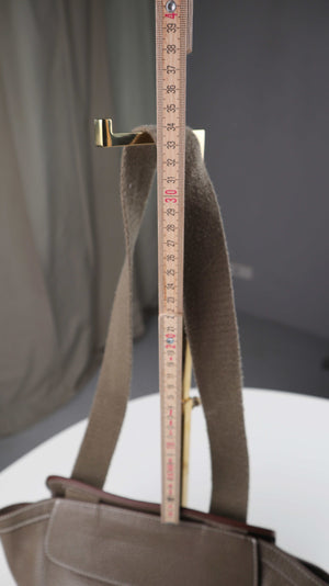 Braune Ledertasche ohne Marke. Breiter Gurt, man kann sie oben an einem Deckel öffnen. Plus Versand