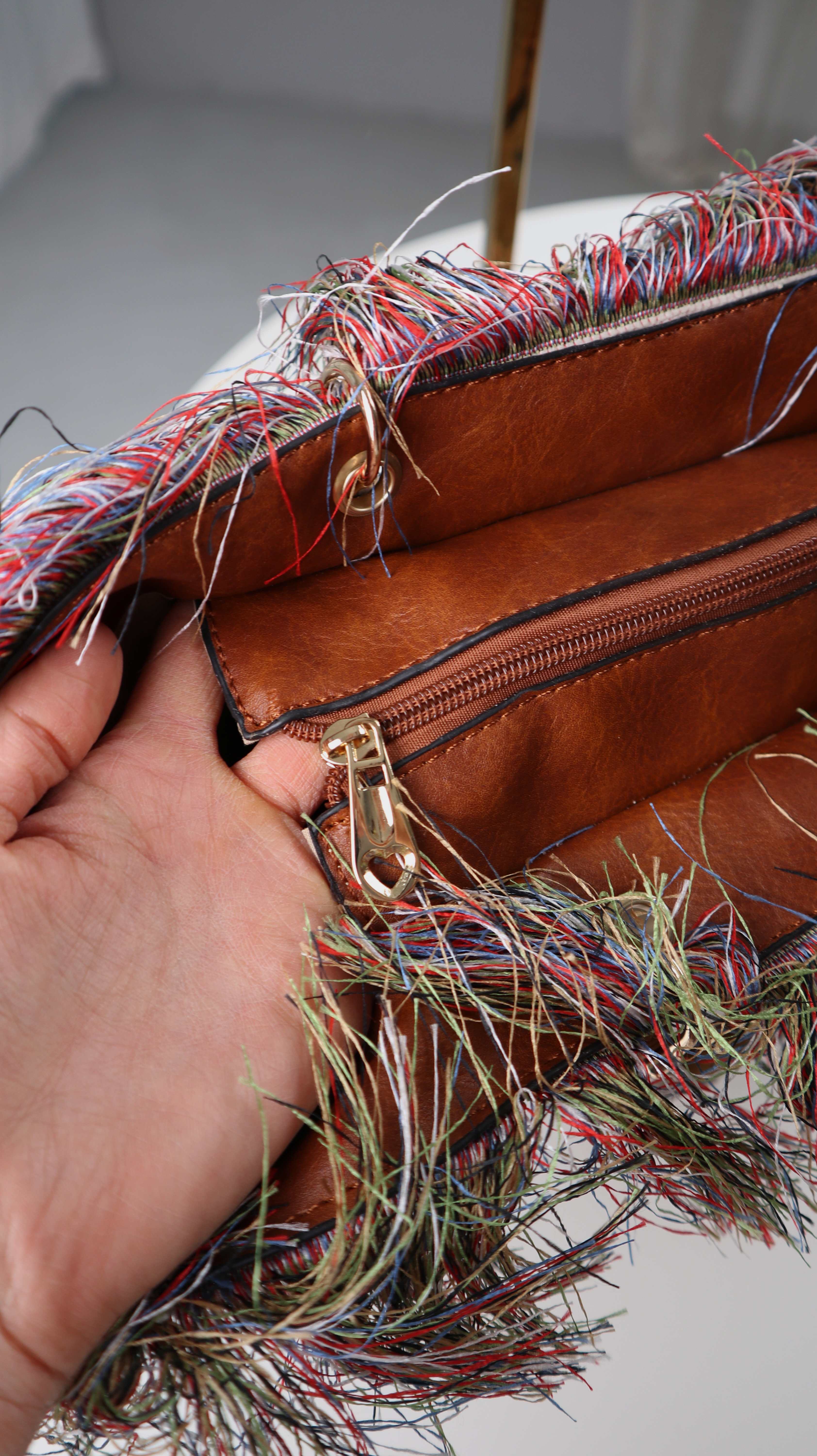 Sehr schöne, neue Hippietasche mit Fransen. Ein Gurt ist im Inneren vorhanden. Innen ist Stoff, die Griffe sind aus Kunststoff. Plus Versand