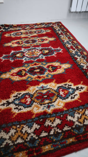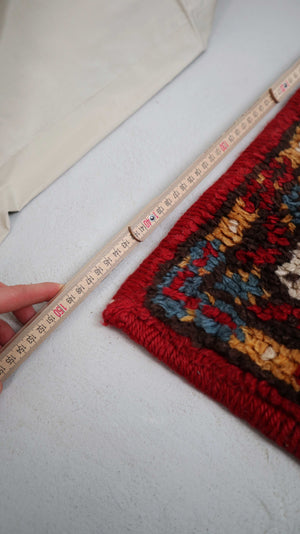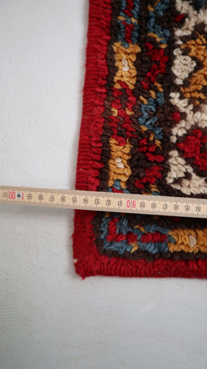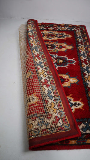 Roter, gereinigter Wollteppich aus den 70ern in den Maßen 150 x 95 cm. Auf der Rückseite ist eine feste Anti-Rutschmatte. Plus Versand