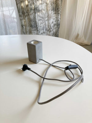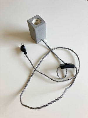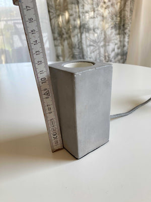 Graue Tischlampe aus Beton. Eine normale Glühbirne kann in die Fassung gesetzt werden, funktioniert. Plus Versand