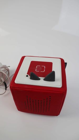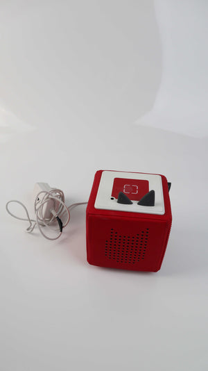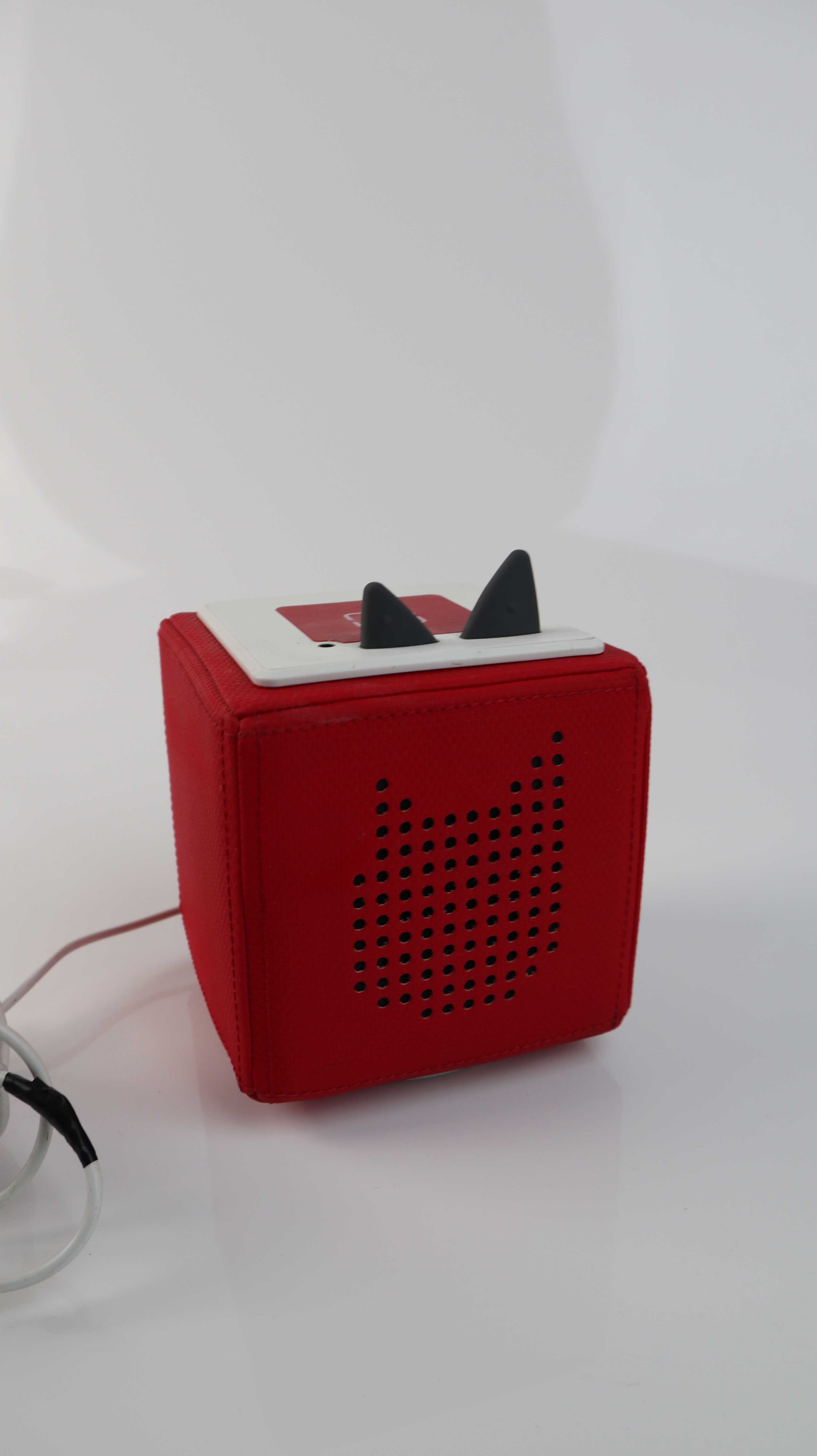 Toniebox in rot. Beim Kabel habe ich eine Stelle mit Elektroklebeband verdichtet, da es leicht rissig war. Sie funktioniert. Plus Versand