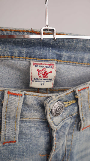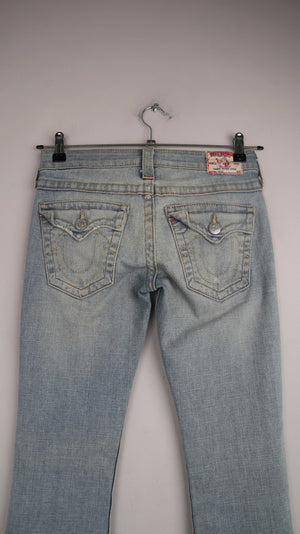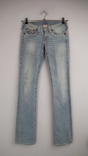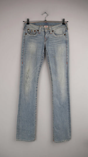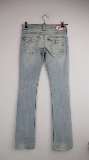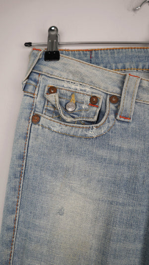 Hellblaue Jeans von True Religion in Größe 27. 39 cm Bundweite, 17 cm Schritthöhe und 83 cm Innenbeinlänge. Plus Versand
