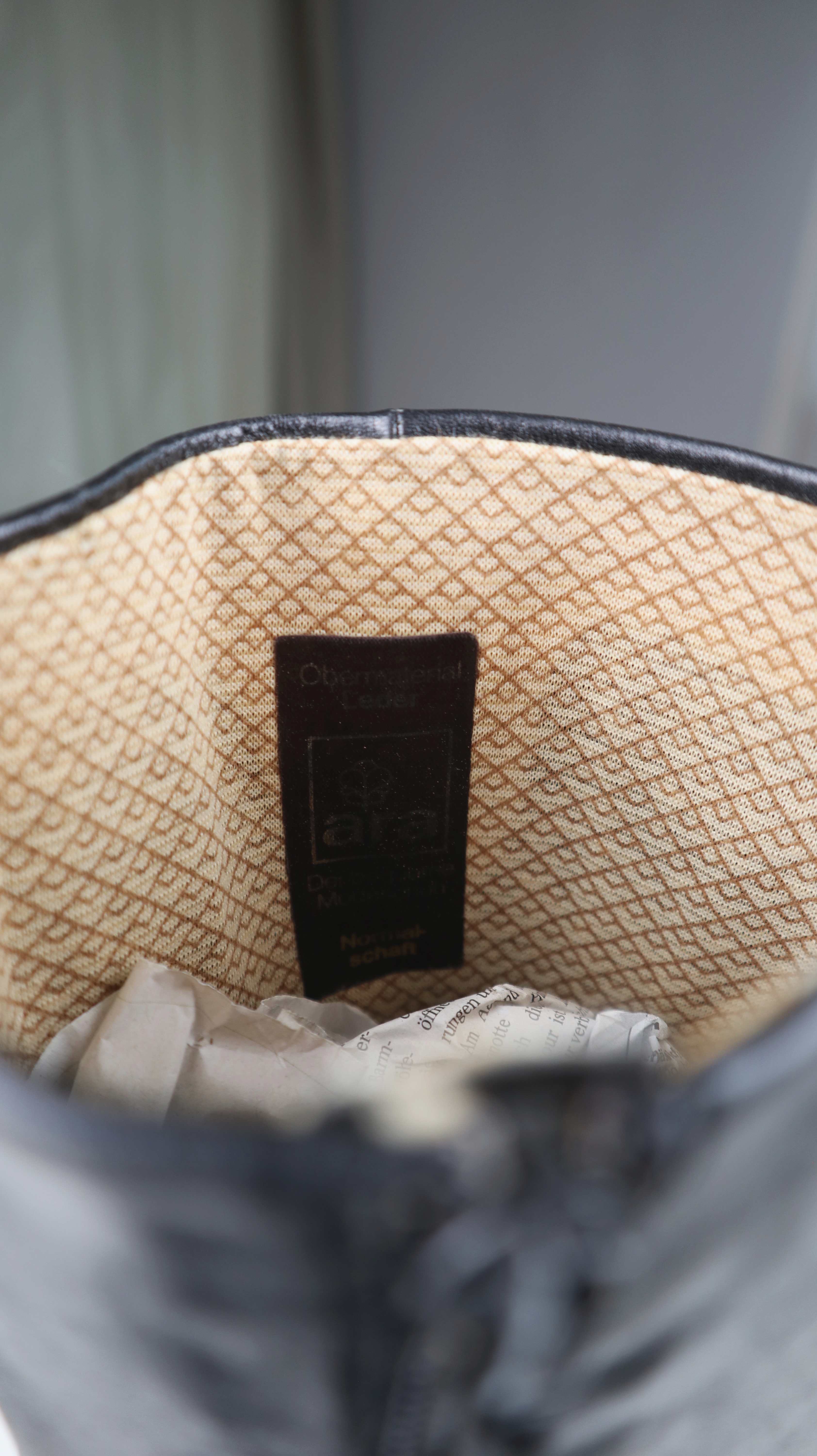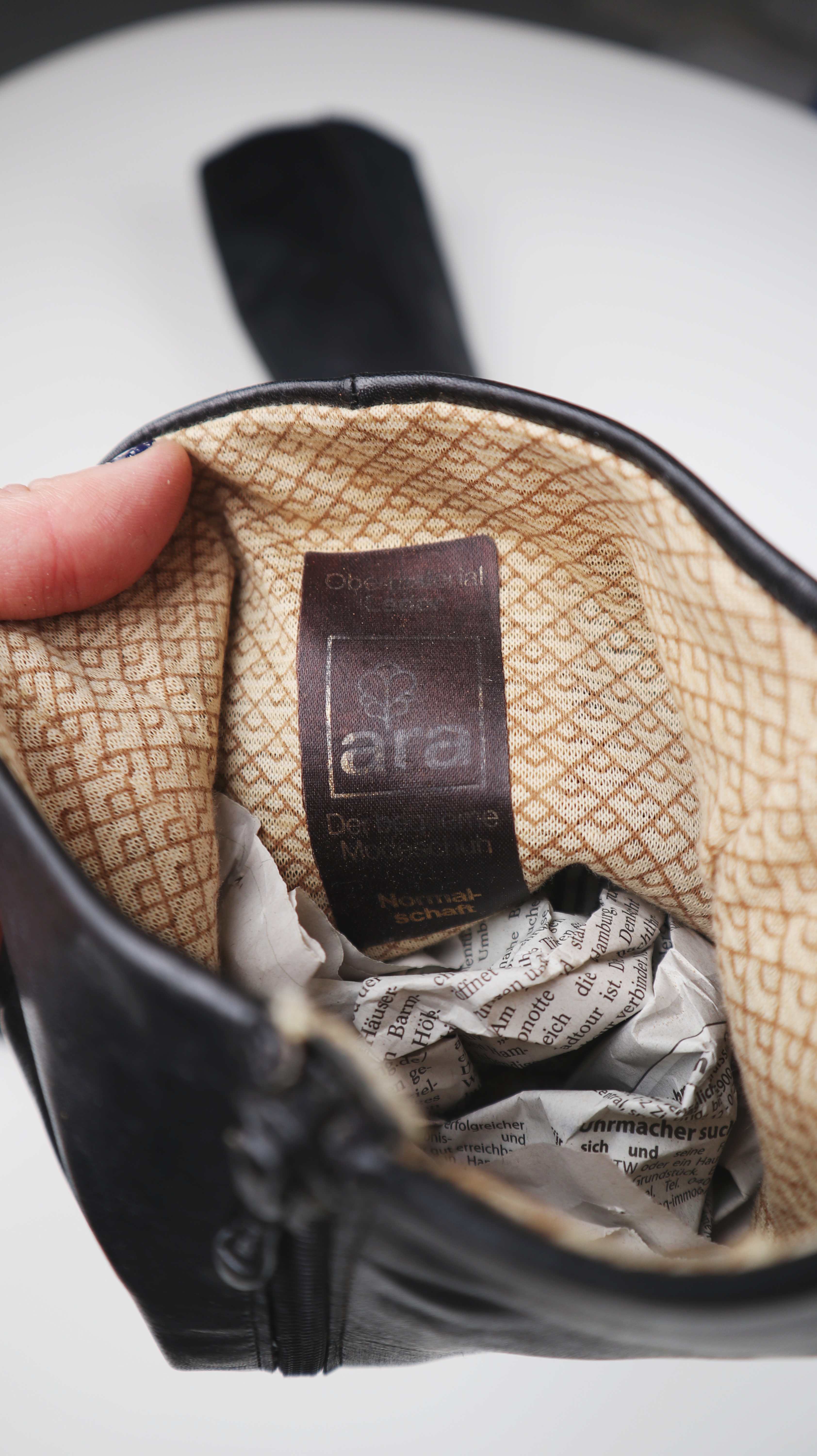 Schwarze Lederstiefel von Ara in Größe 39. Sie sind innen etwas genutzt, das Innenfutter ist teils sehr stark auf Höhe vom Fuß genutzt. Man kann die dennoch normal tragen. Sie passen einer 39 mit normaler Wade. Plus Versand