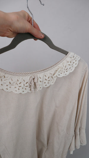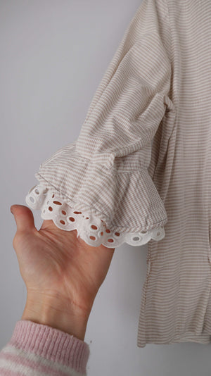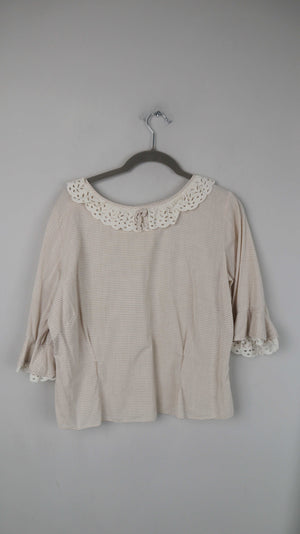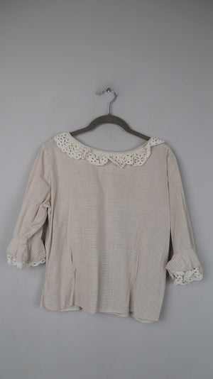 Beige Bluse mit einem Spitzenkragen in Beige. 52 cm Achselweite und 48 cm Länge. Sie ist Vintage. Plus Versand