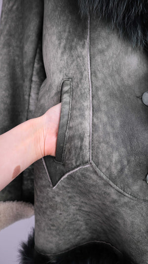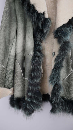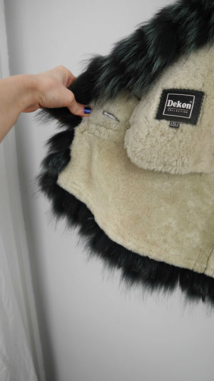 Sehr besondere Vintage Lederjacke mit Lammfell. Der Kragen lässt sich hochklappen, Taschen vorhanden. Innen kuschlig. Die Marke ist Dekon, ausgeschildert mit einer XL. Sie passt jedoch einer 38 M und fällt auch so aus, daher gebe ich sie so an. Oben rechts fehlt ein Knopf für den Kragen. 50 cm Achselweite und 75 cm Länge. Plus Versand