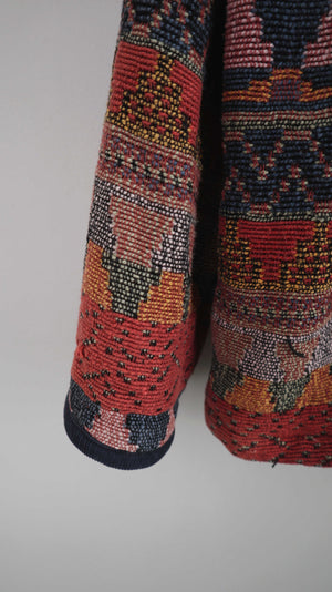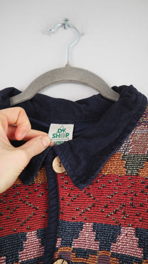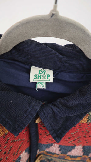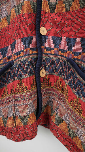 Blaue rote Jacke mit Azetekenmuster und Cordkragen. Sie passt einer XL. 56 cm Achselweite und 70 cm Länge. Plus Versand
