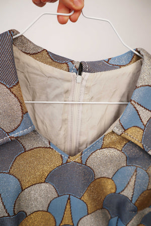 Vintagekleid in gold blau. Es passt einer 38 M. Hinten ist ein kleiner Reißverschluss. 46 cm Achselweite und 99 cm Länge. Plus Versand