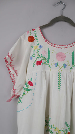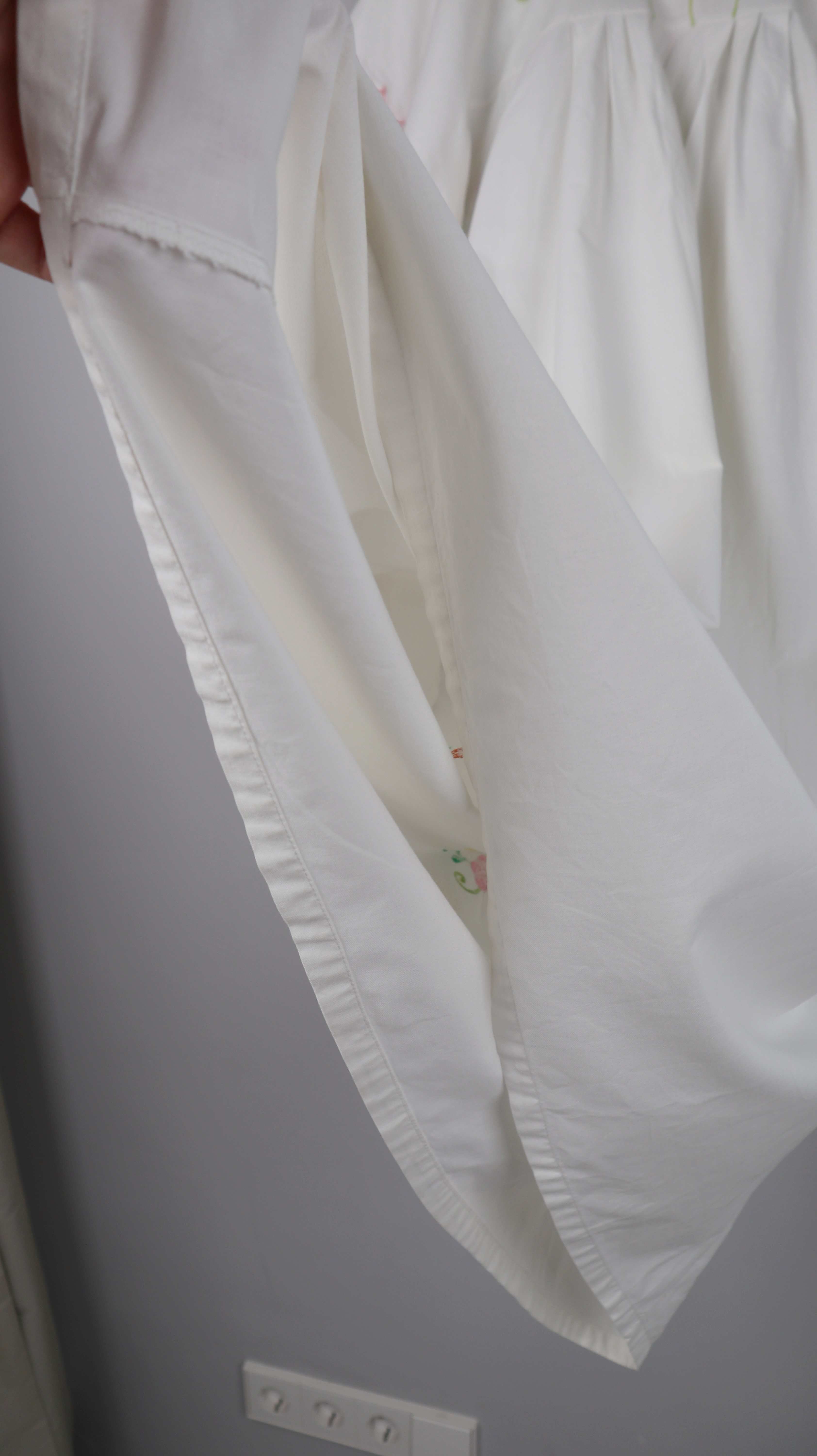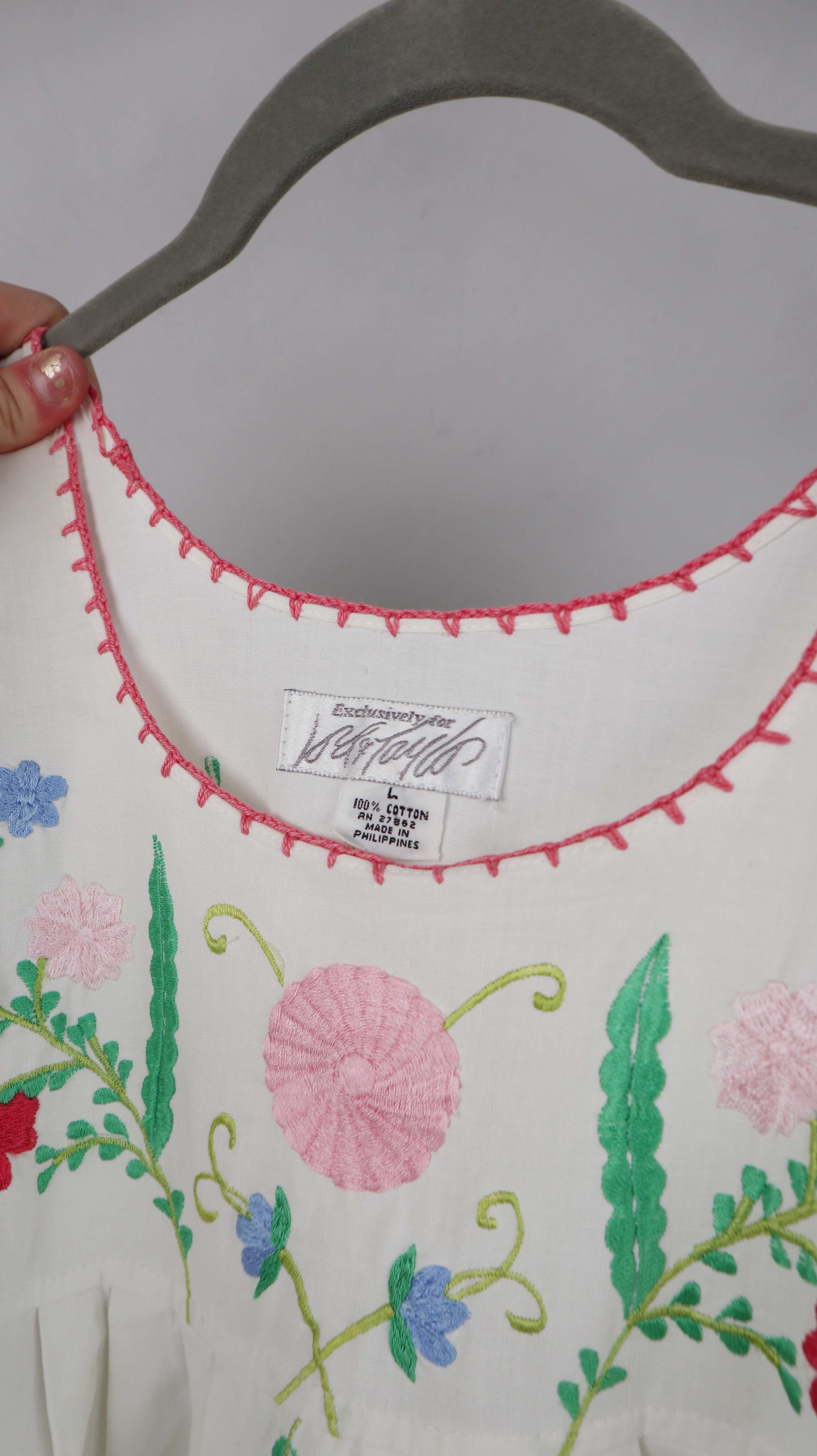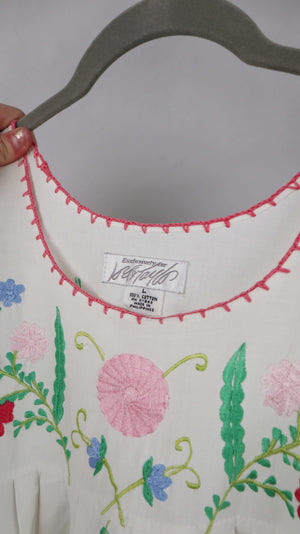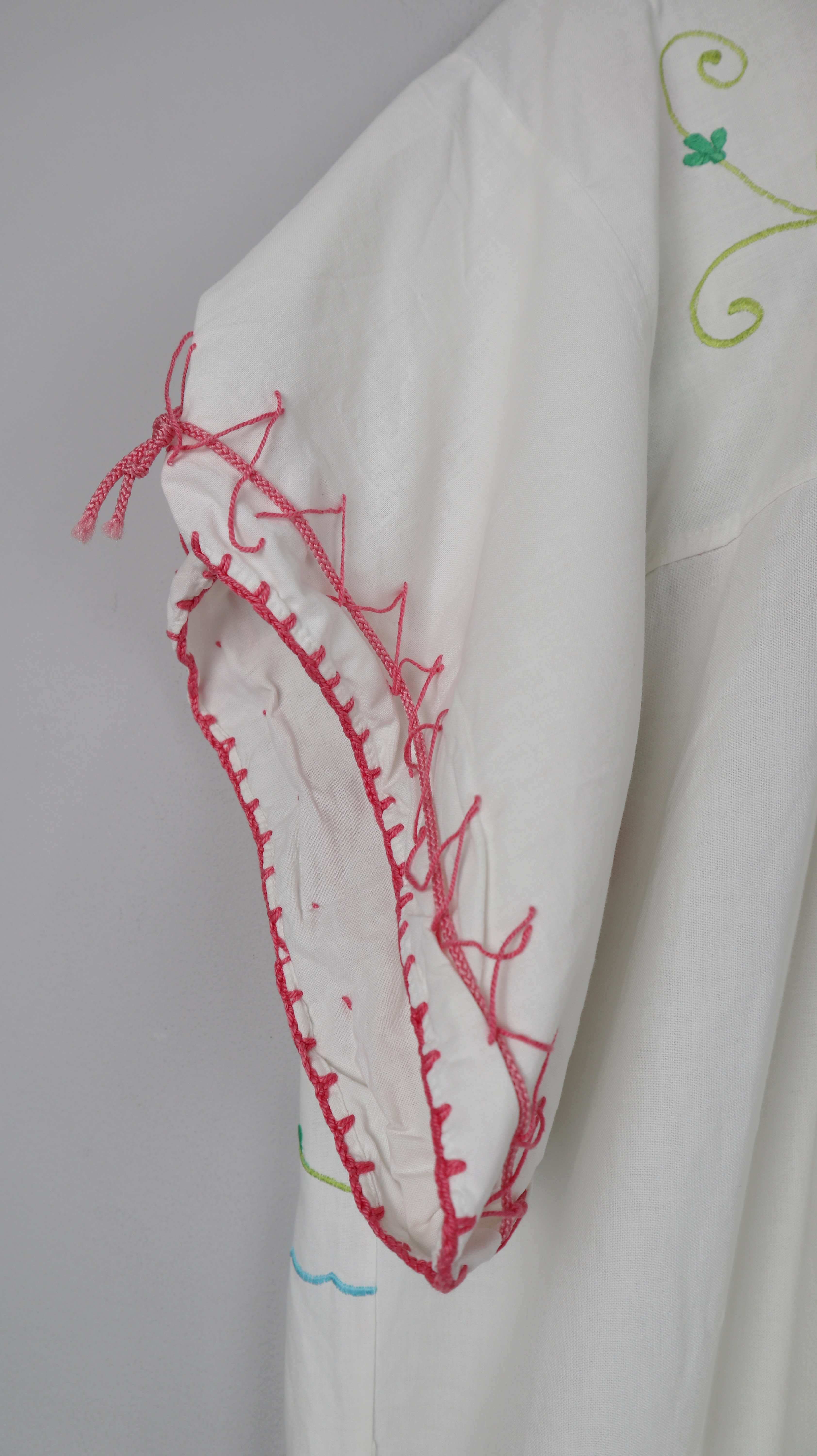 Weißes, besticktes Vintage Kleid mit vielen Details. Es ist sehr besonders und passt einer 38 M. 56 cm Achselweite und 93 cm Länge. Plus Versand