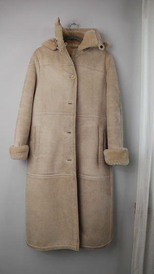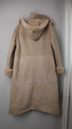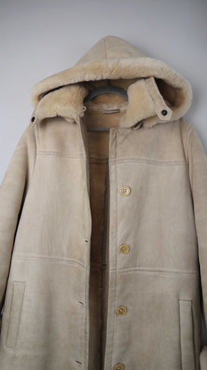 Beiger Vintage Lammfellmantel mit Kapuze. Er passt einer 38 M bis 40 L. 47 cm Achselweite und 110 cm Länge. Plus Versand