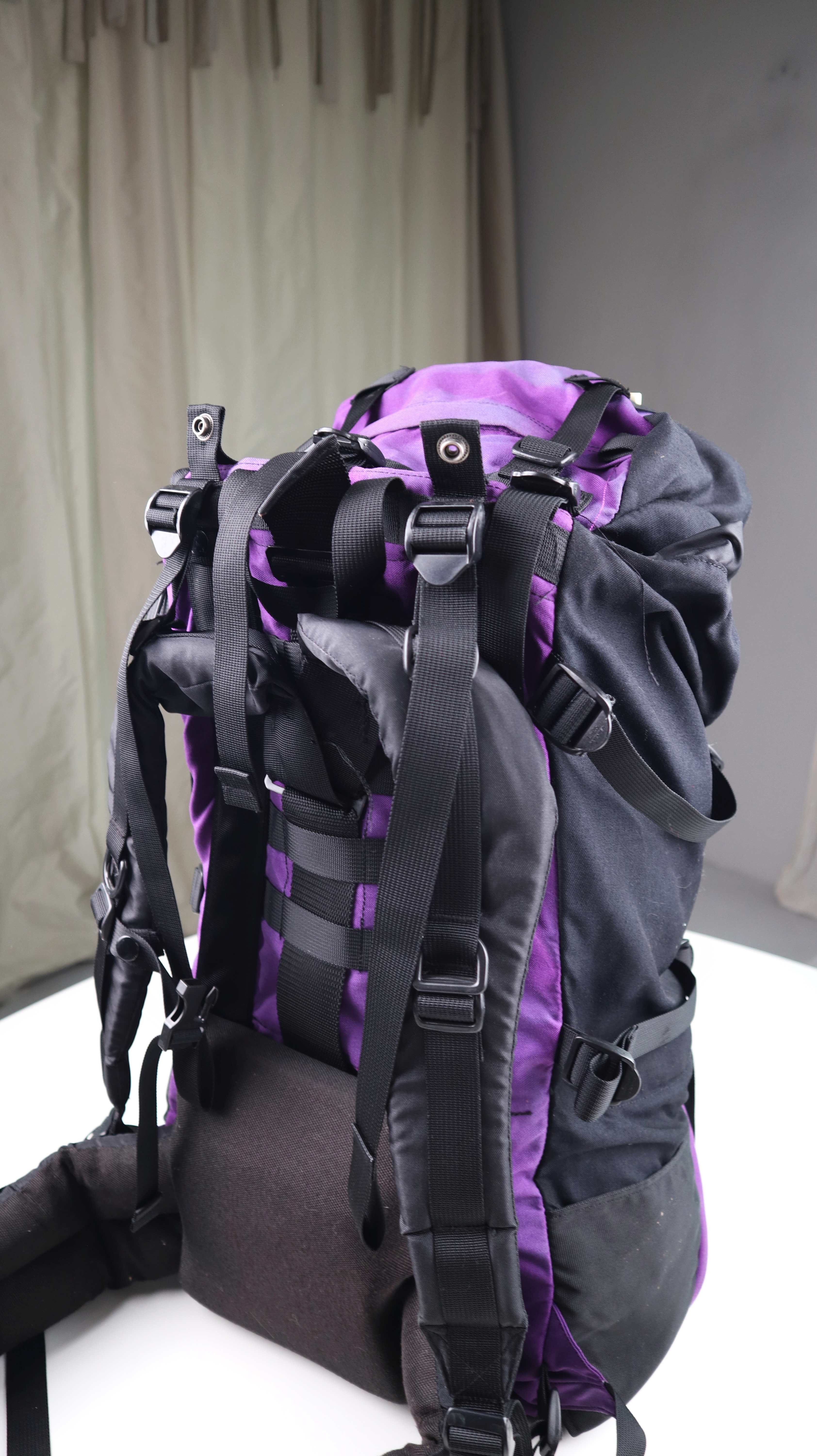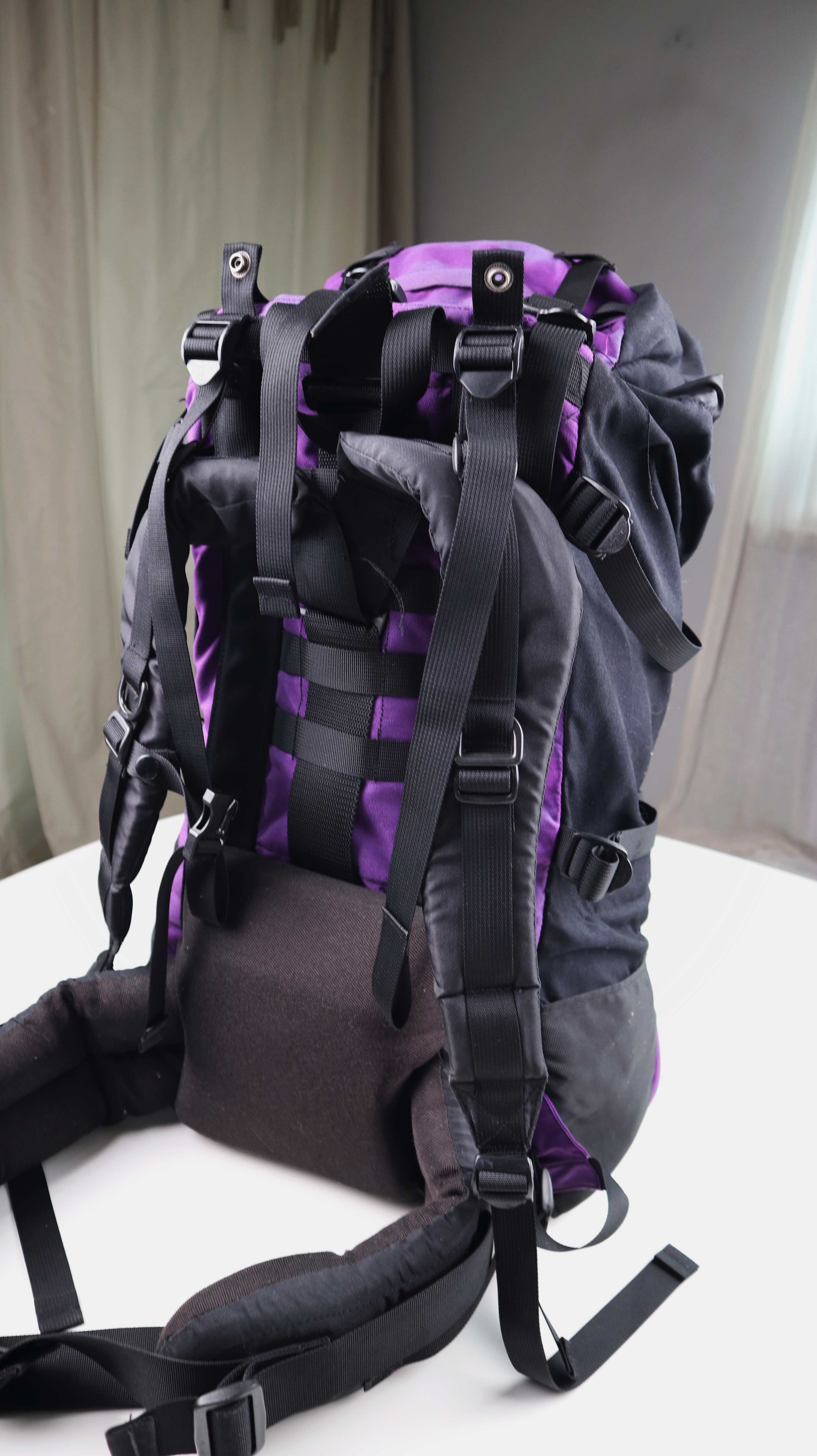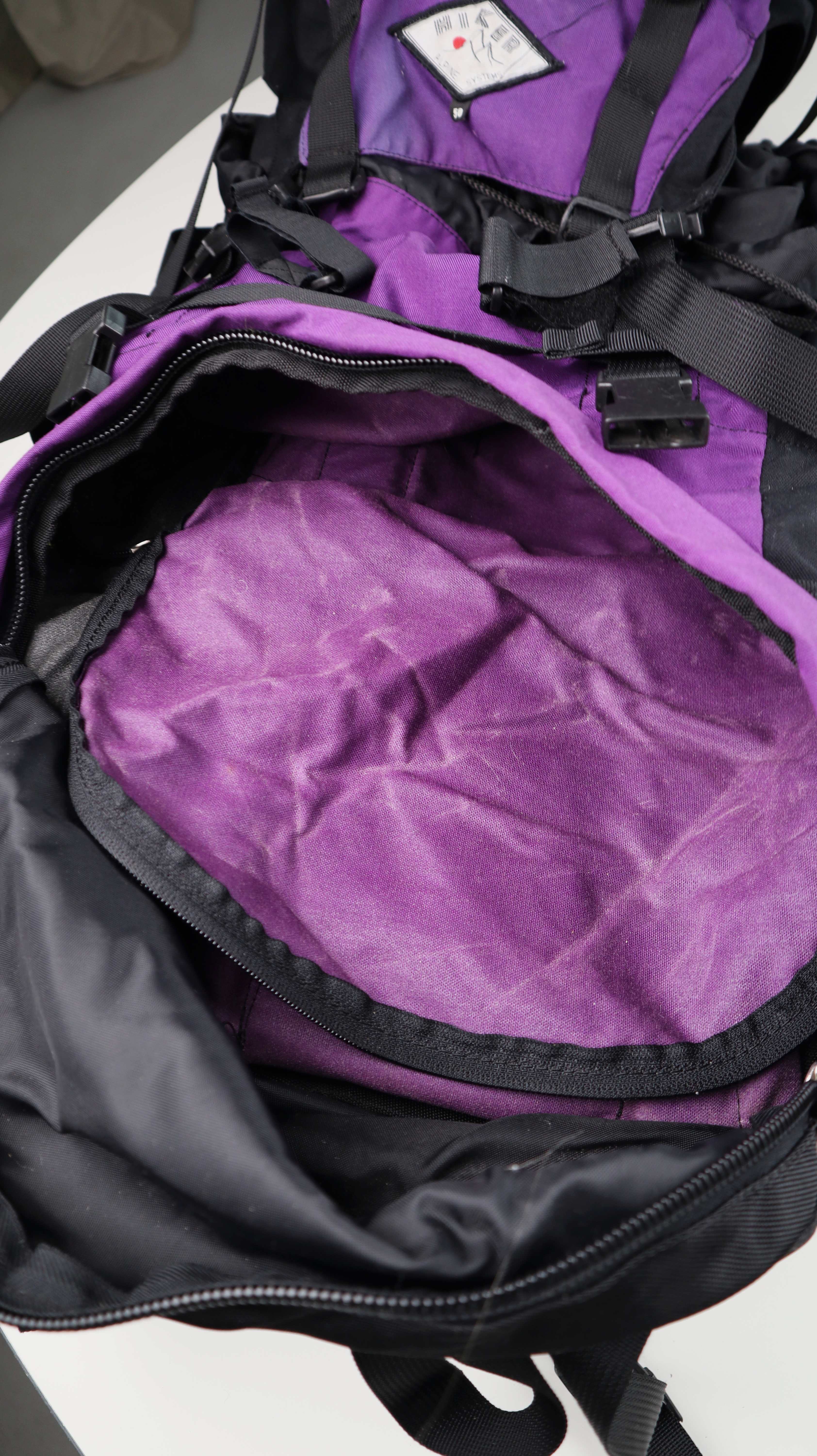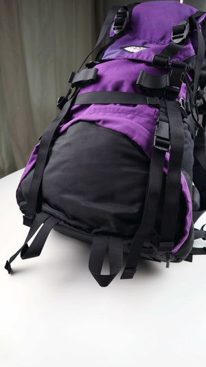 Lila Wanderrucksack. Er ist Vintage, dennoch sehr gut vom Zustand, fasst etwa 55 Liter und hat innen Unterteilungen. Plus Versand