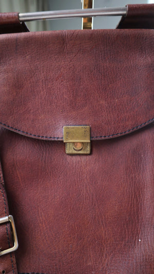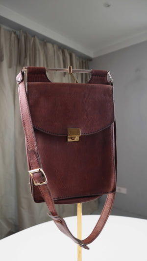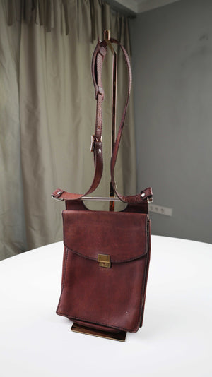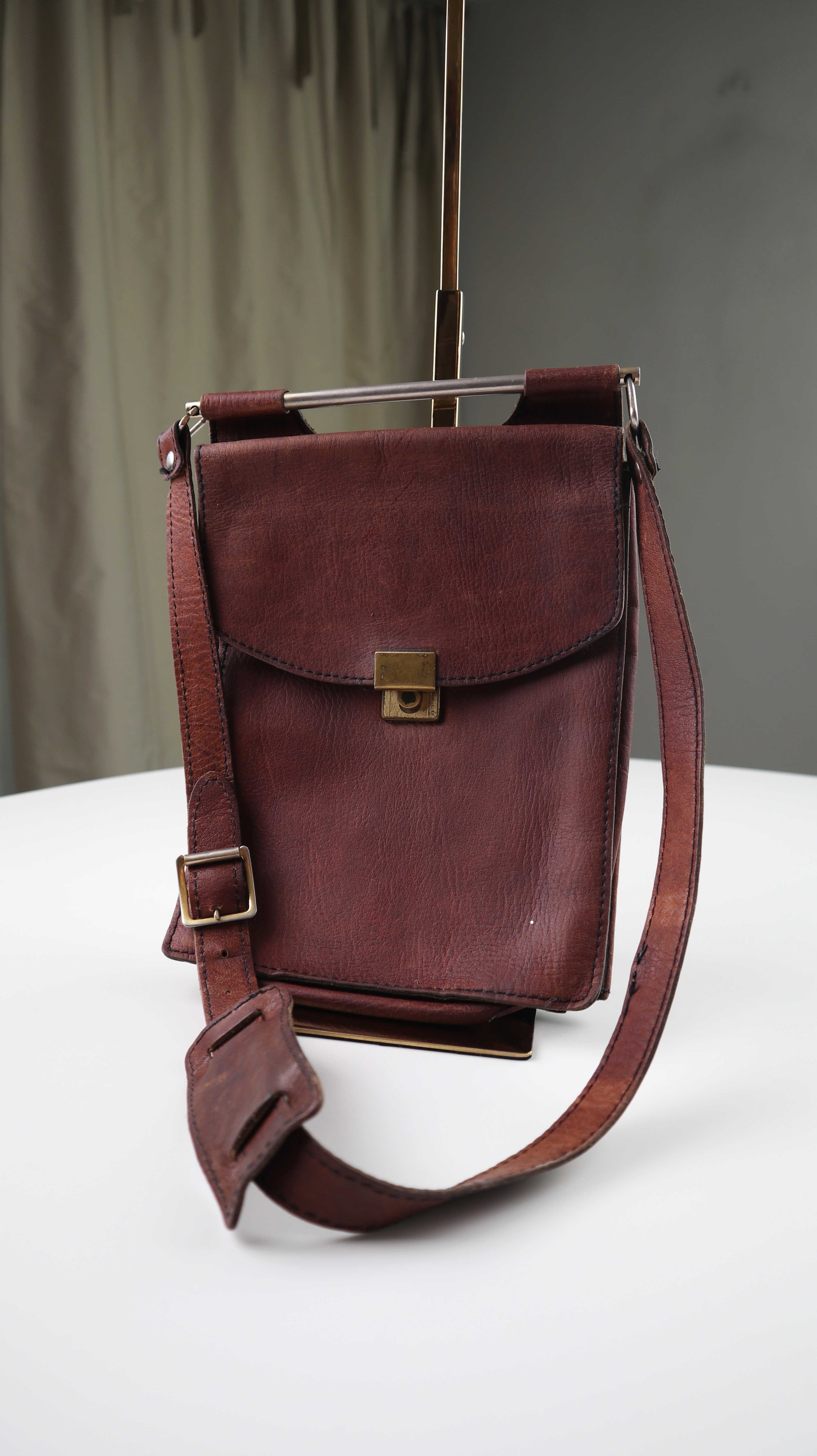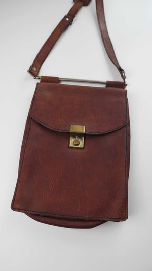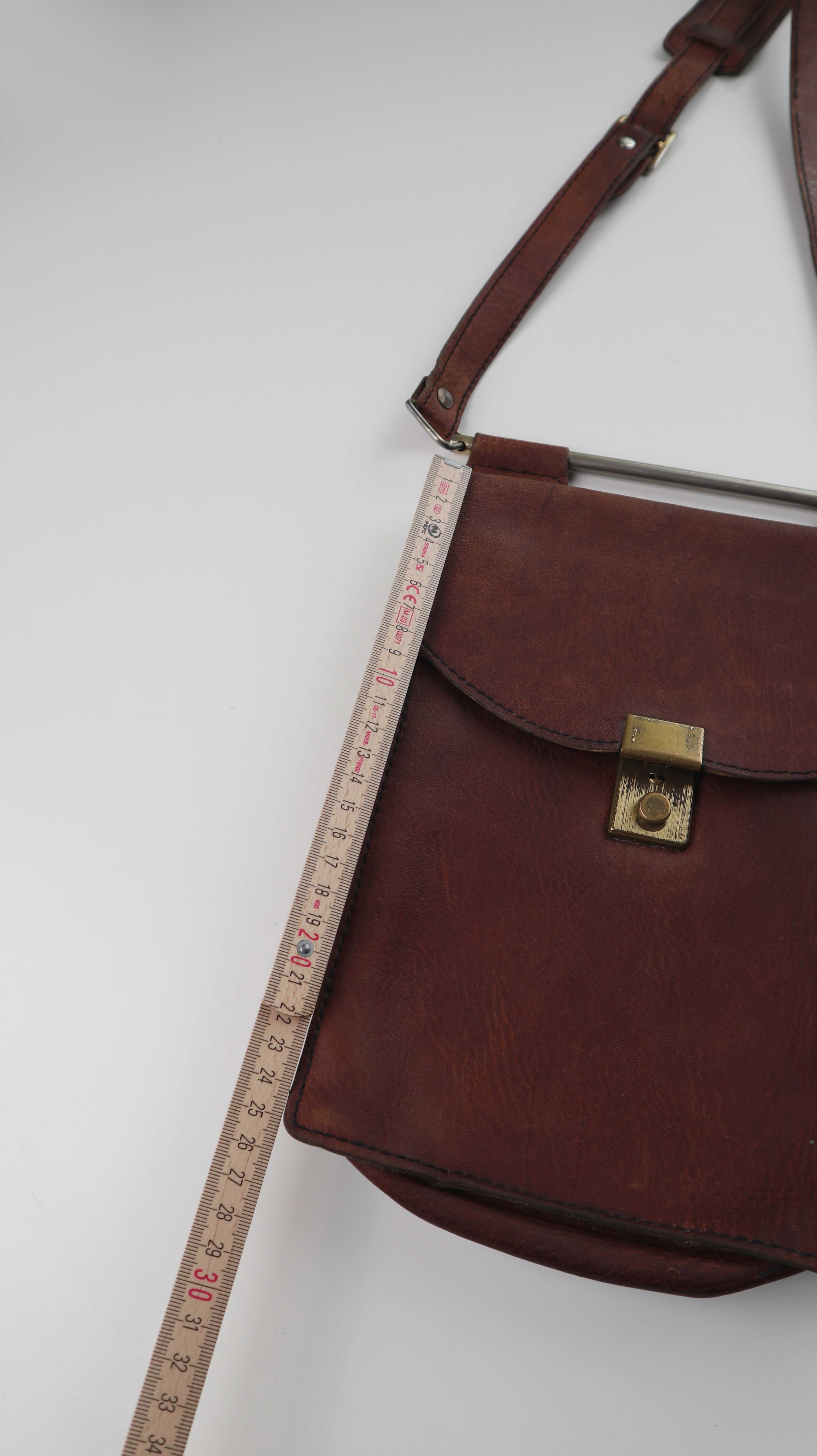 Längliche Vintage Umhängetasche. Sie hat vorne das Fach mit der Klappe oben und auf der Rückseite einen weiteren Deckel, den man öffnen kann und Visitenkarten einstecken kann. Plus Versand