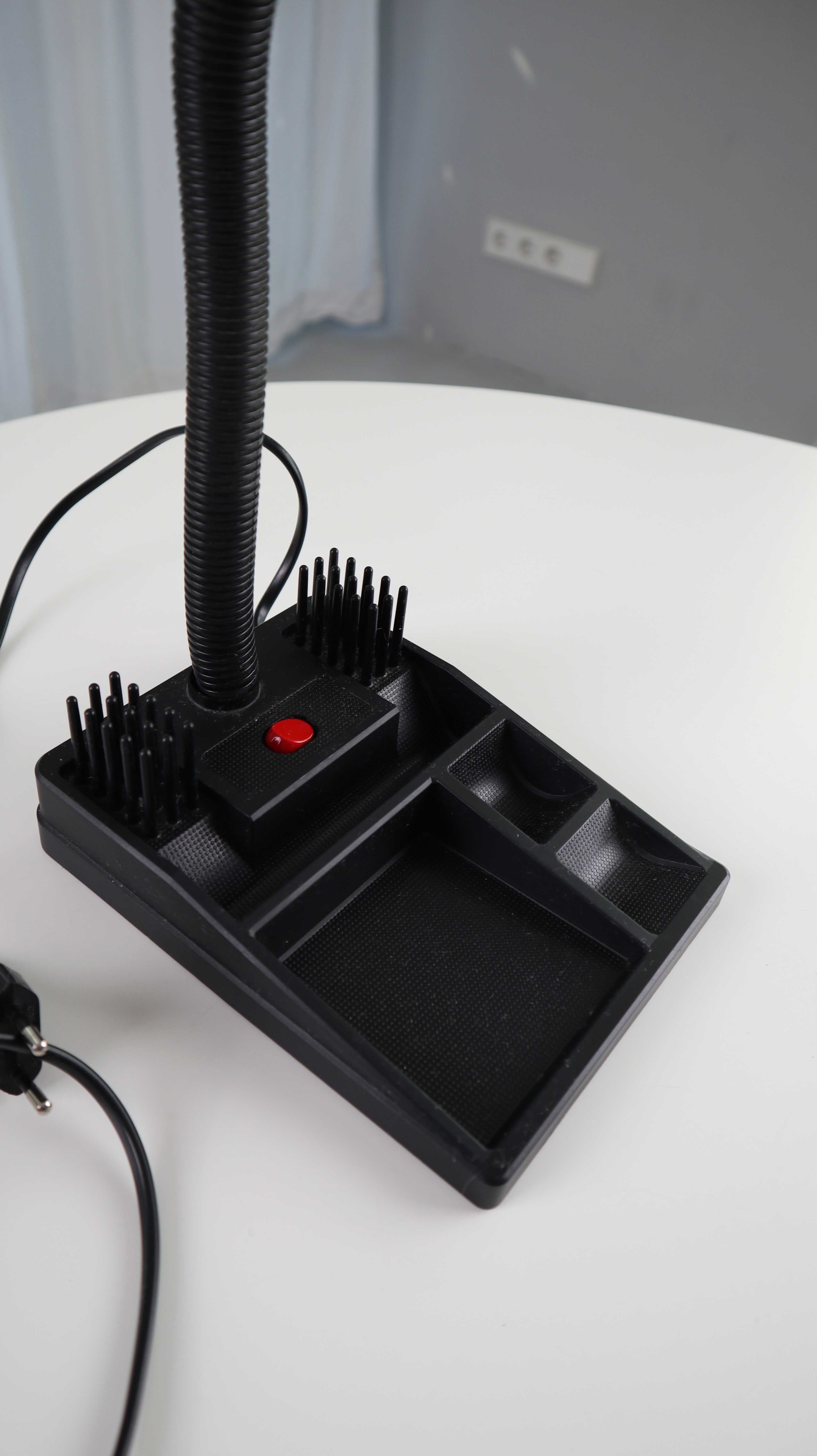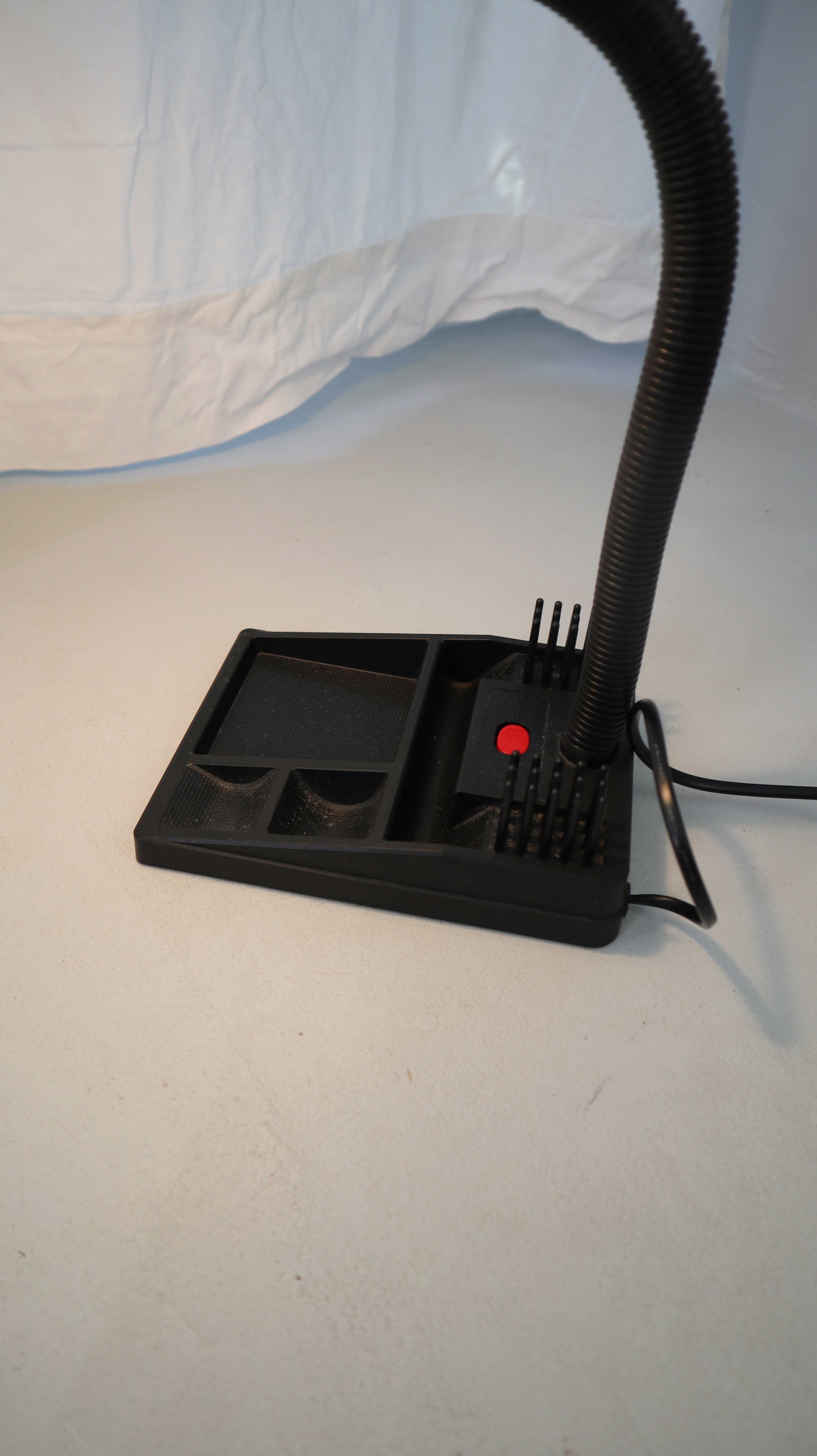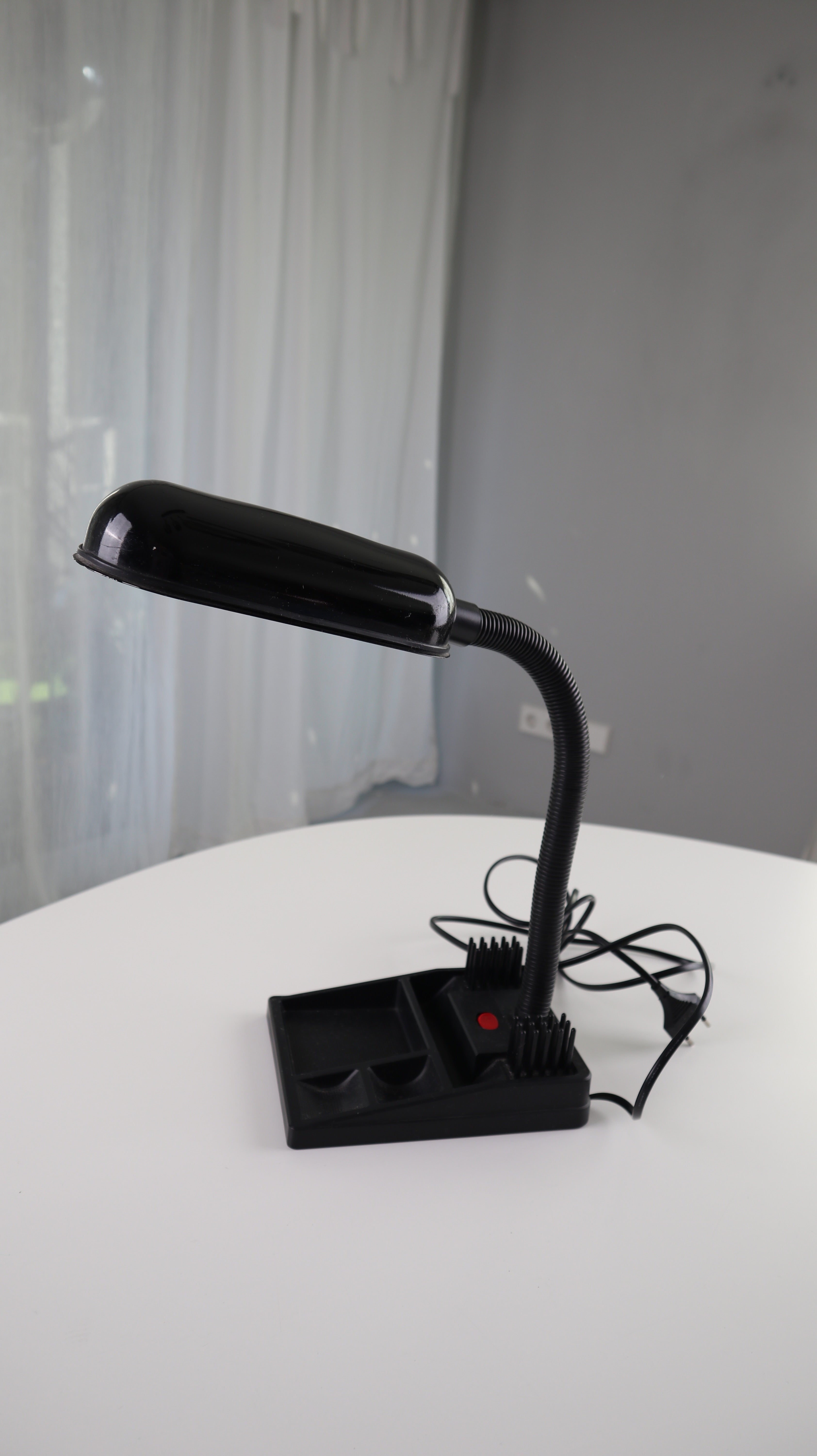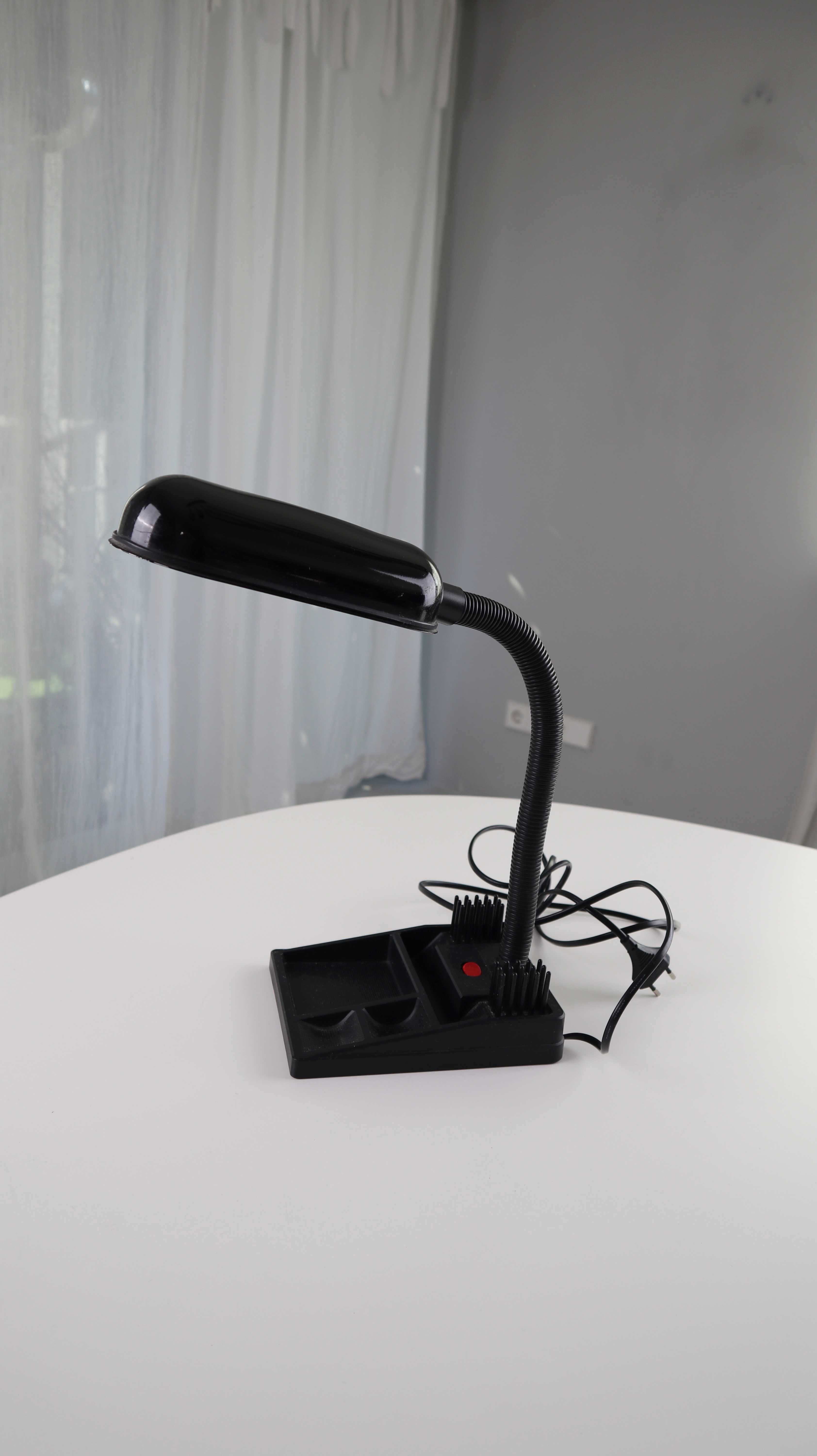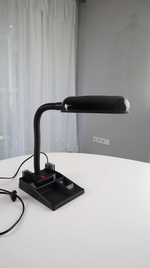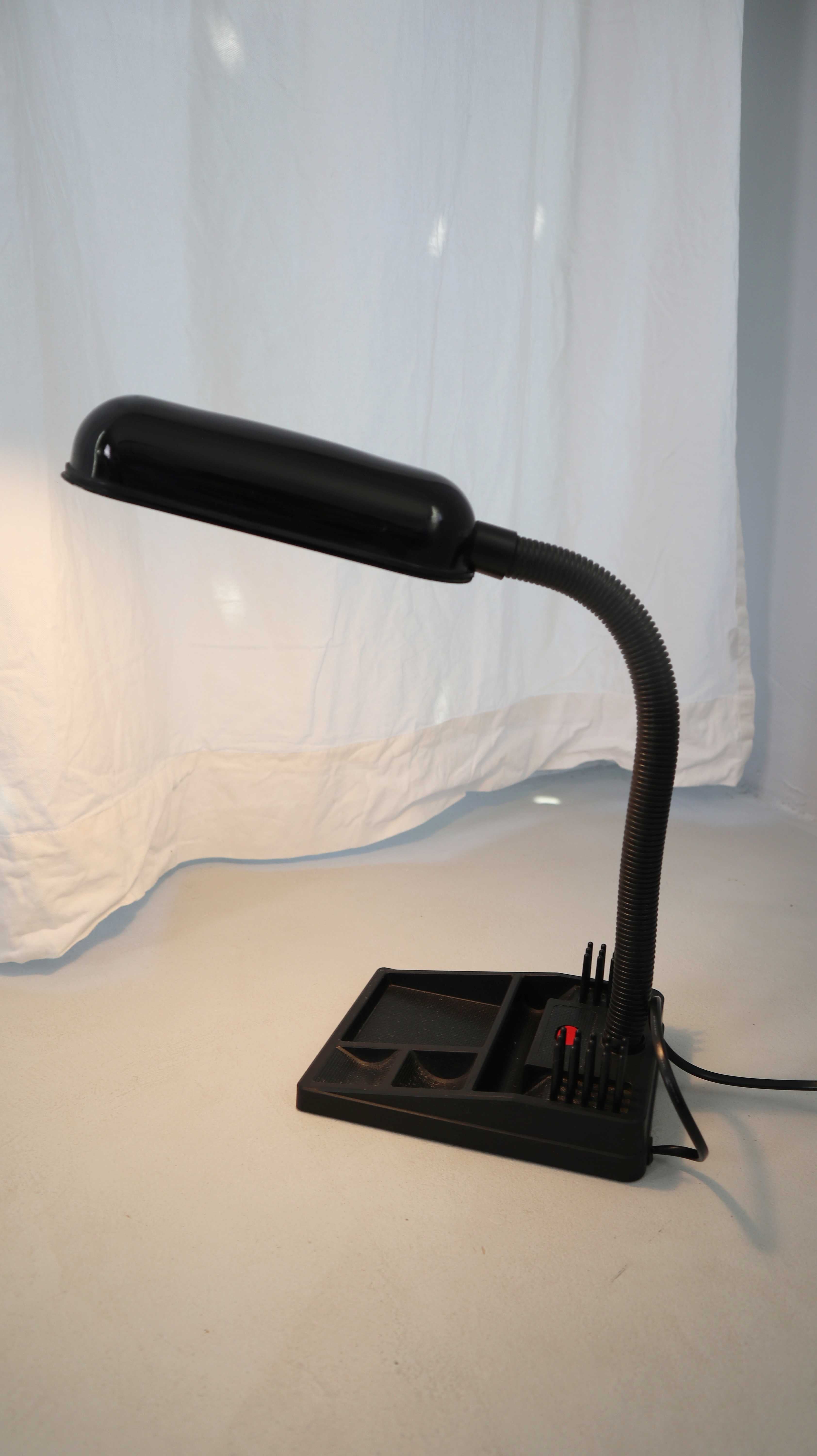 Schwarze Schreibtischlampe mit einem Fach für Utensilien aus den 70ern. Plus Versand