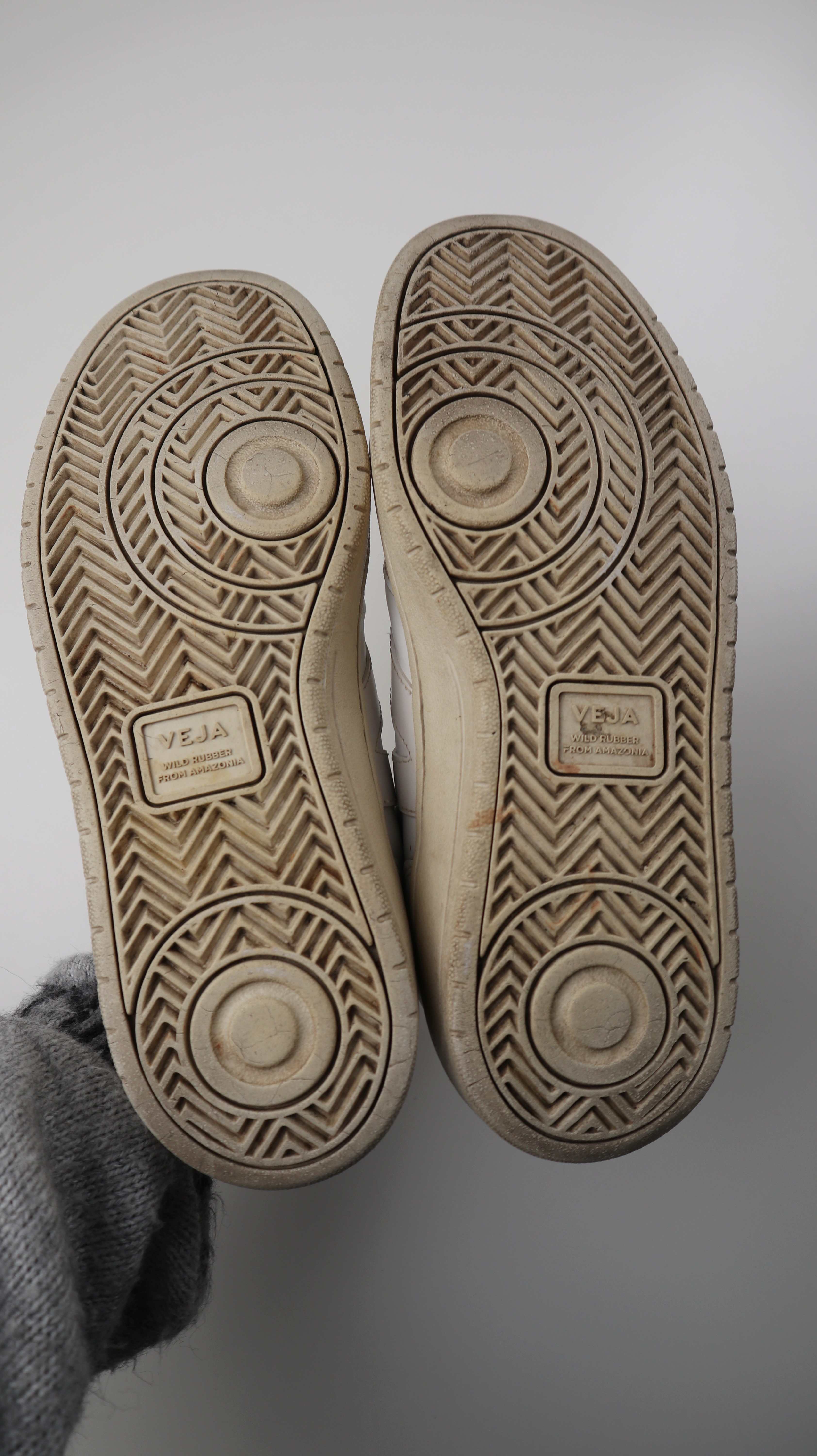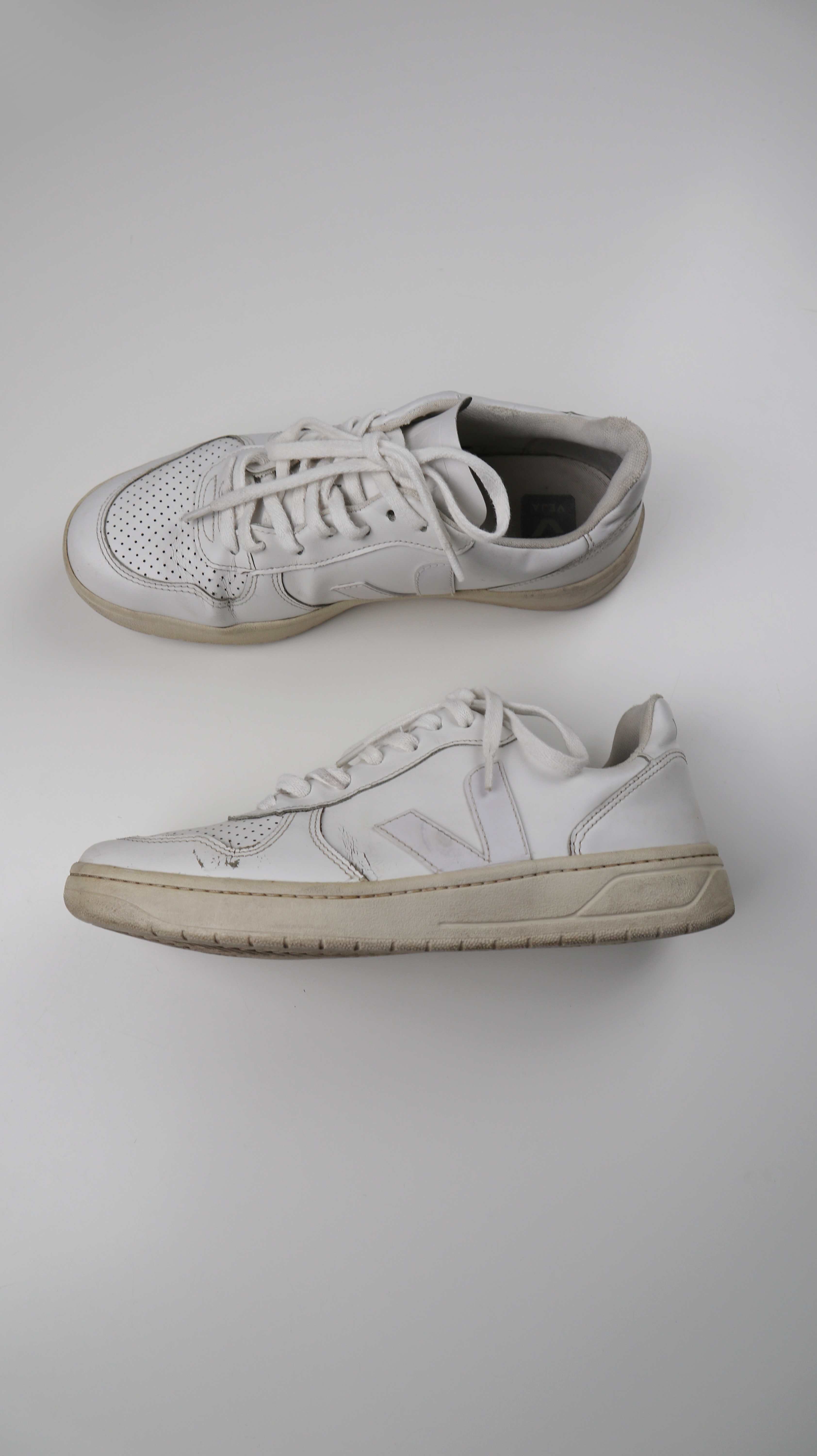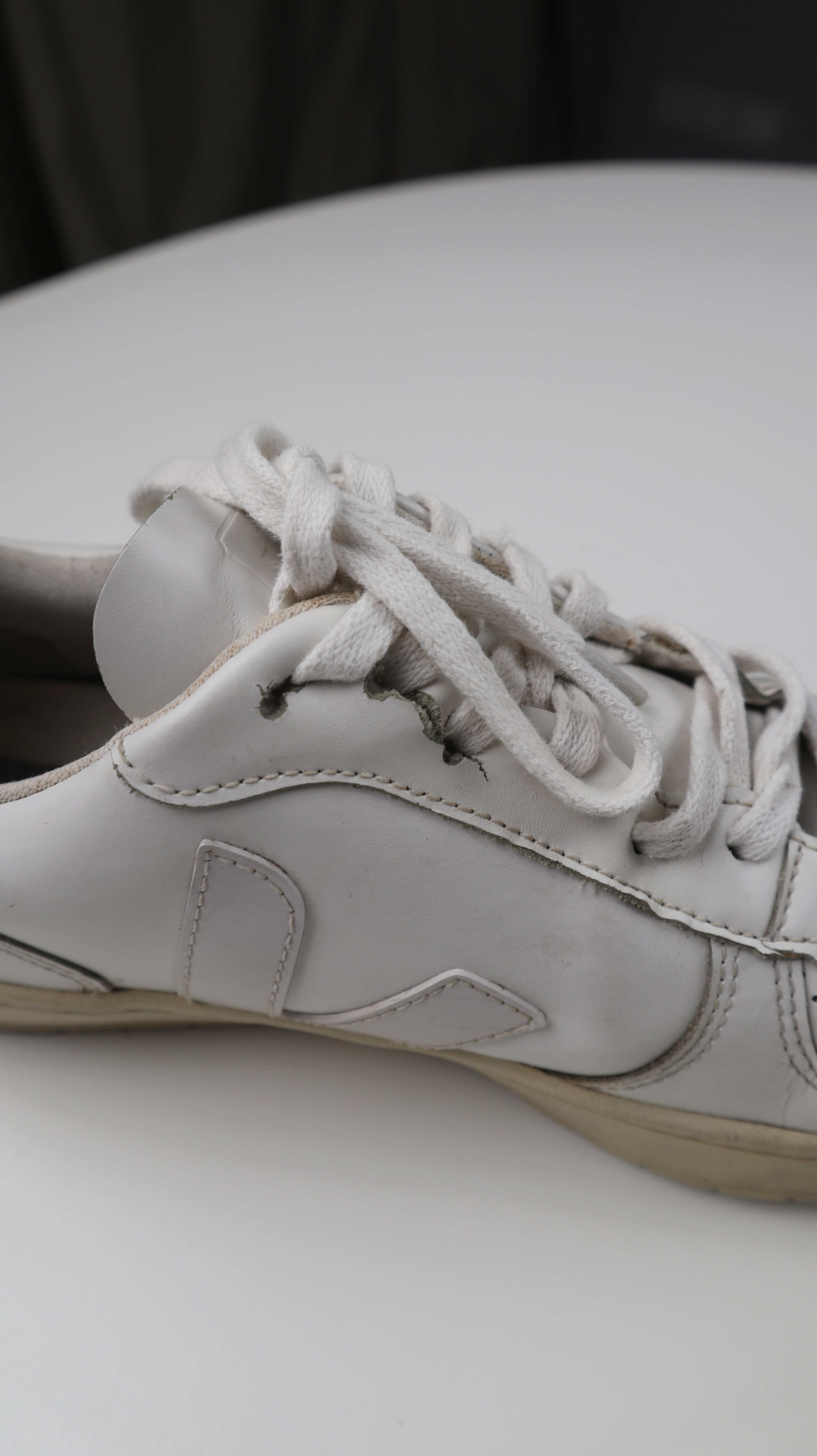 Weiße Sneaker von Veja in Größe 42. Sie sind an einer Stelle oben bei den Schnürsenkeln leicht gerissen. Plus Versand