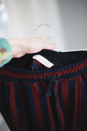 Blau rot gestreifte Hose von Vicolo. Sie passt einer 38 M wunderbar und wird oben mit einem Band zugezogen. 35 cm Bundweite, 27 cm Schritthöhe und 72 cm Innenbeinlänge. Plus Versand