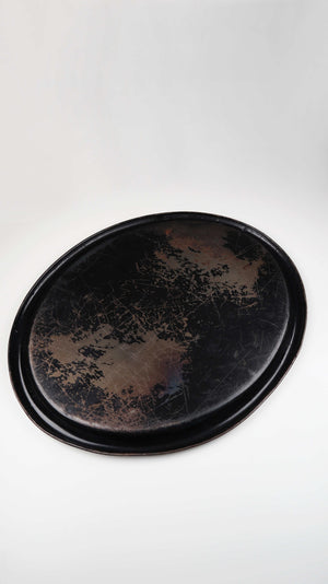 Schwarzes Tablett, ovale Form, Intarsien und Bemalungen von Eicheln. 47 x 58. Plus Versand