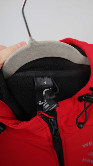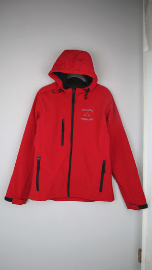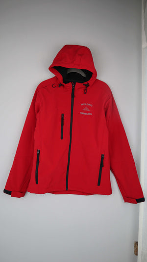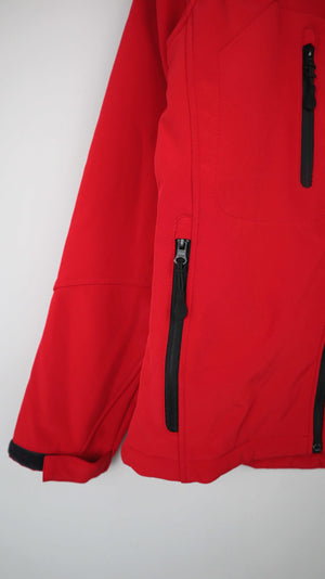 Rote Softshelljacke in 38 M mit Print auf dem Rücken und auf der Brust. 49 cm Achselweite und 62 cm Länge. Plus Versand