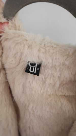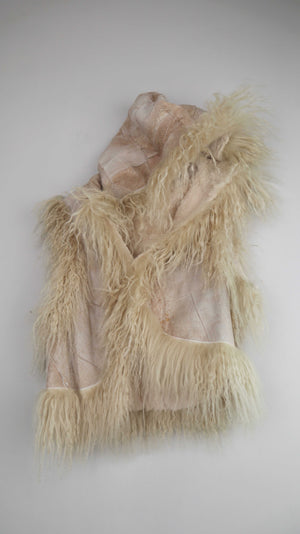 Lammfellweste mit einer Kapuze. Vorne ist ein Haken und man kann sie verschließen. 48 cm Achselweite und 55 cm Länge. Plus Versand