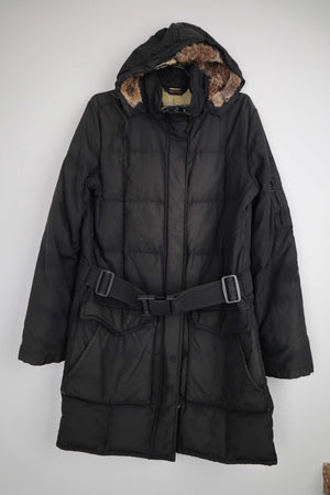 Echter Mantel von Woolrich in schwarz. Hasenfell im Inneren der Kapuze, an einer Stelle nicht ganz ausgefüllt. Vorne eine große Schnalle am Gurt, Schnalle ist an einer Stelle nicht mehr vollständig. Innen beige, Daunengefüttert. Plus Versand