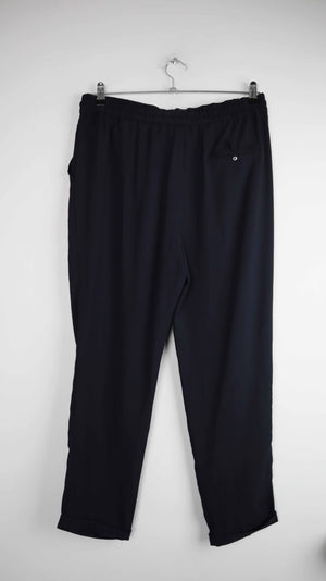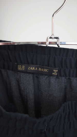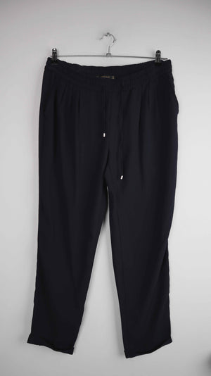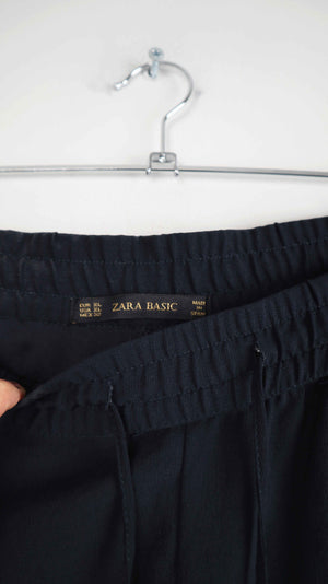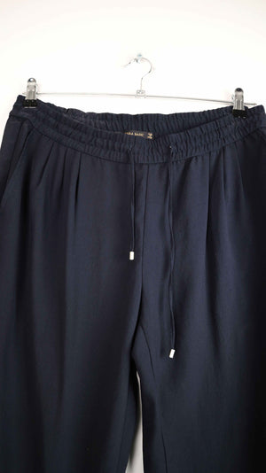 Lockere Stoffhose von Zara Basic in XL. Sie ist dunkelblau und hat vorne Bänder zum Binden. 43 cm Bundweite, 26 cm Schritthöhe, 71 cm Innenbeinlänge. Plus Versand