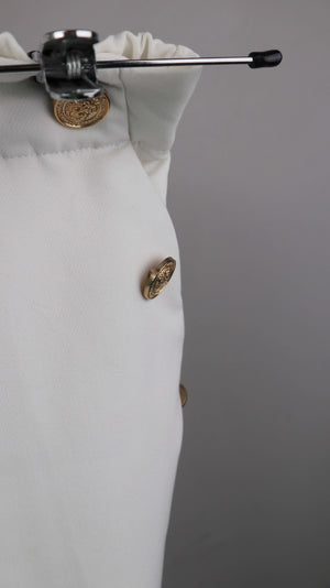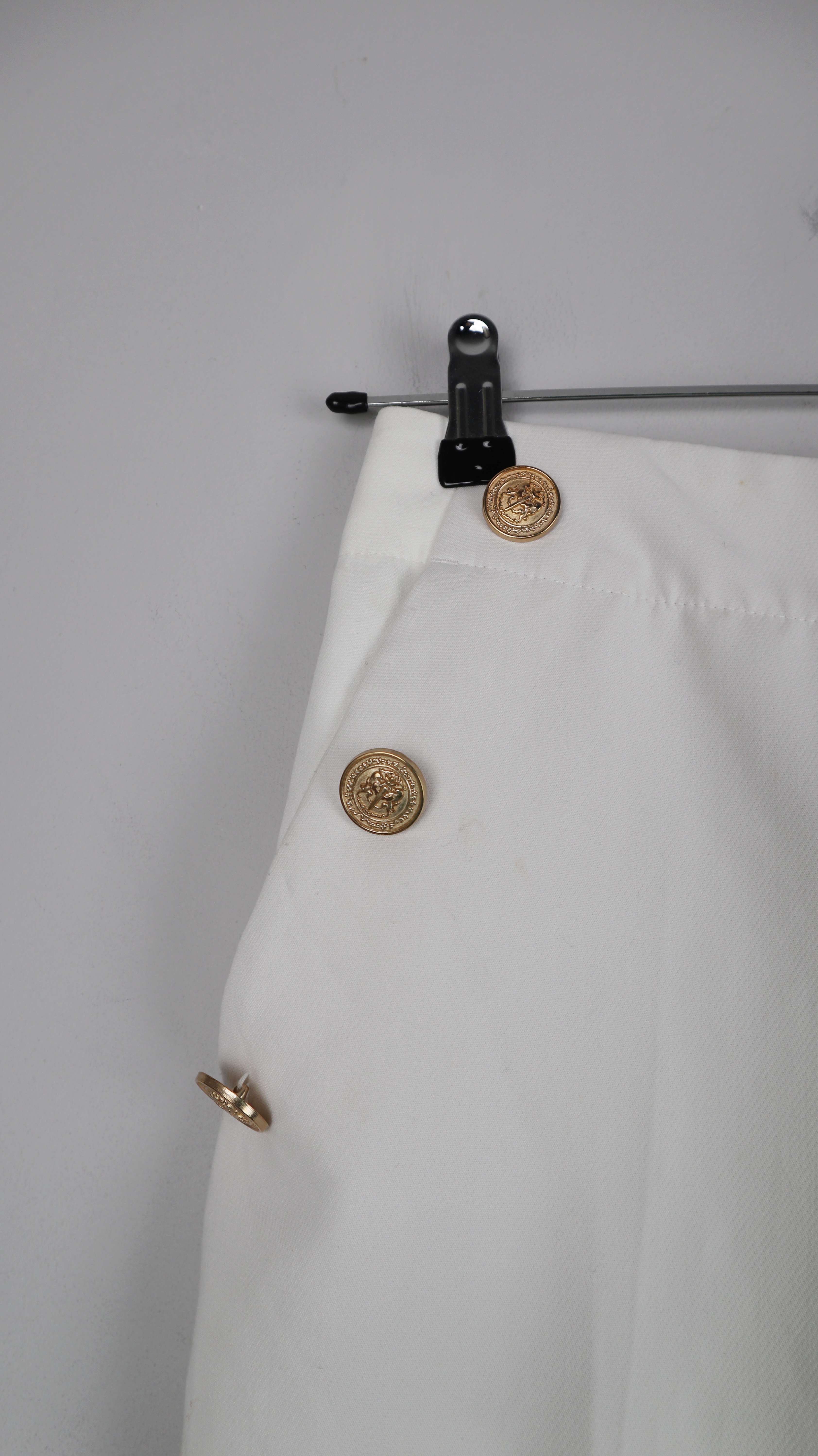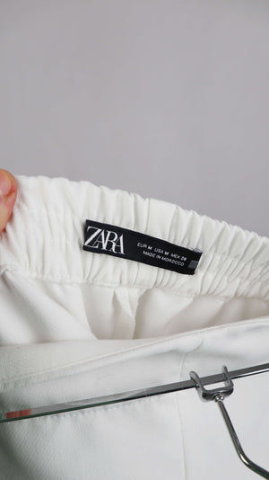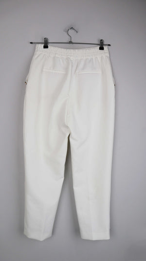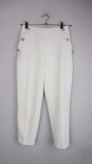 Weiße Stoffhose von Zara in M mit goldenen Knöpfen. 37 cm Bundweite, 30 cm Schritthöhe, 63 cm Innenbeinlänge. Plus Versand